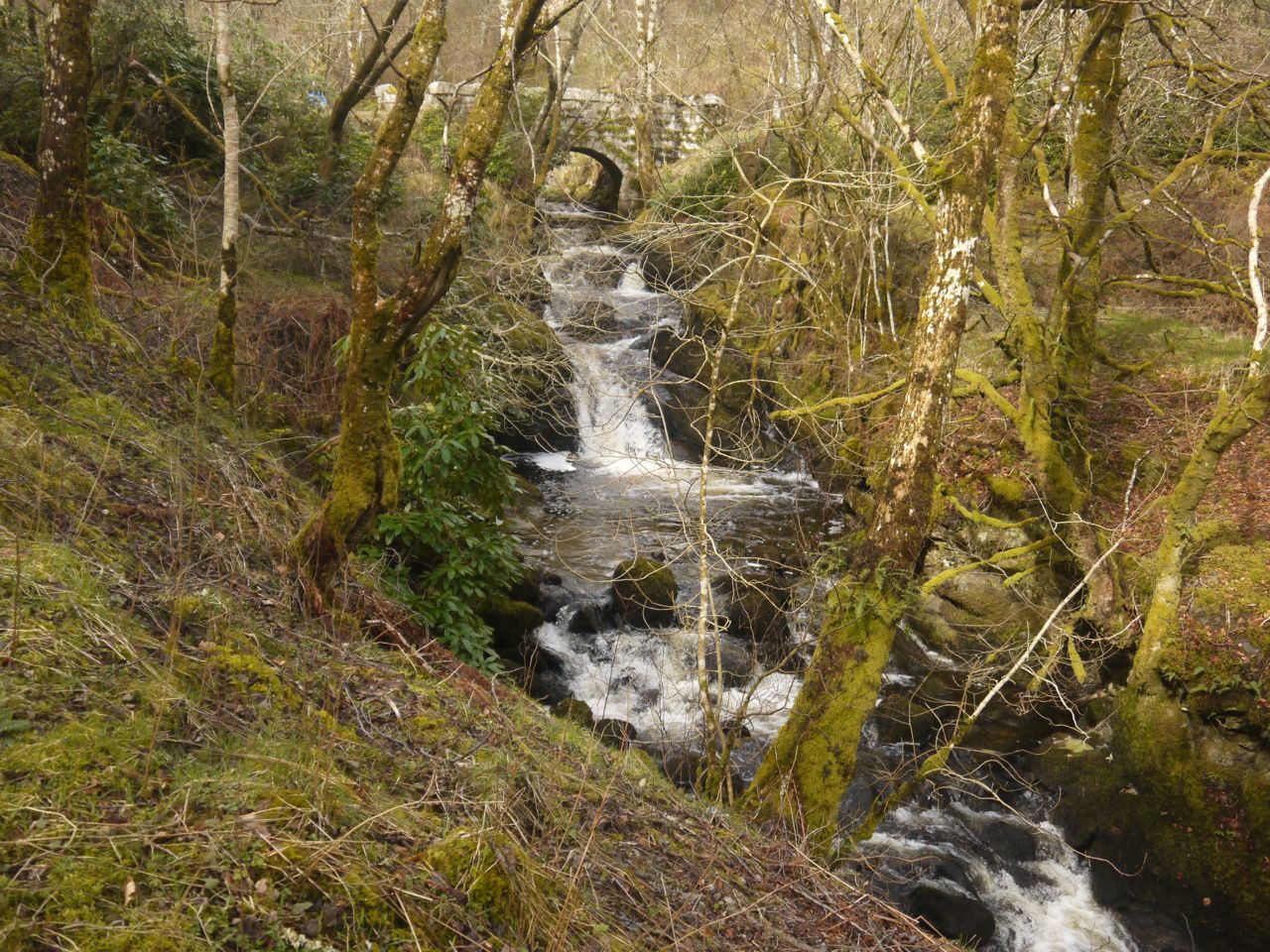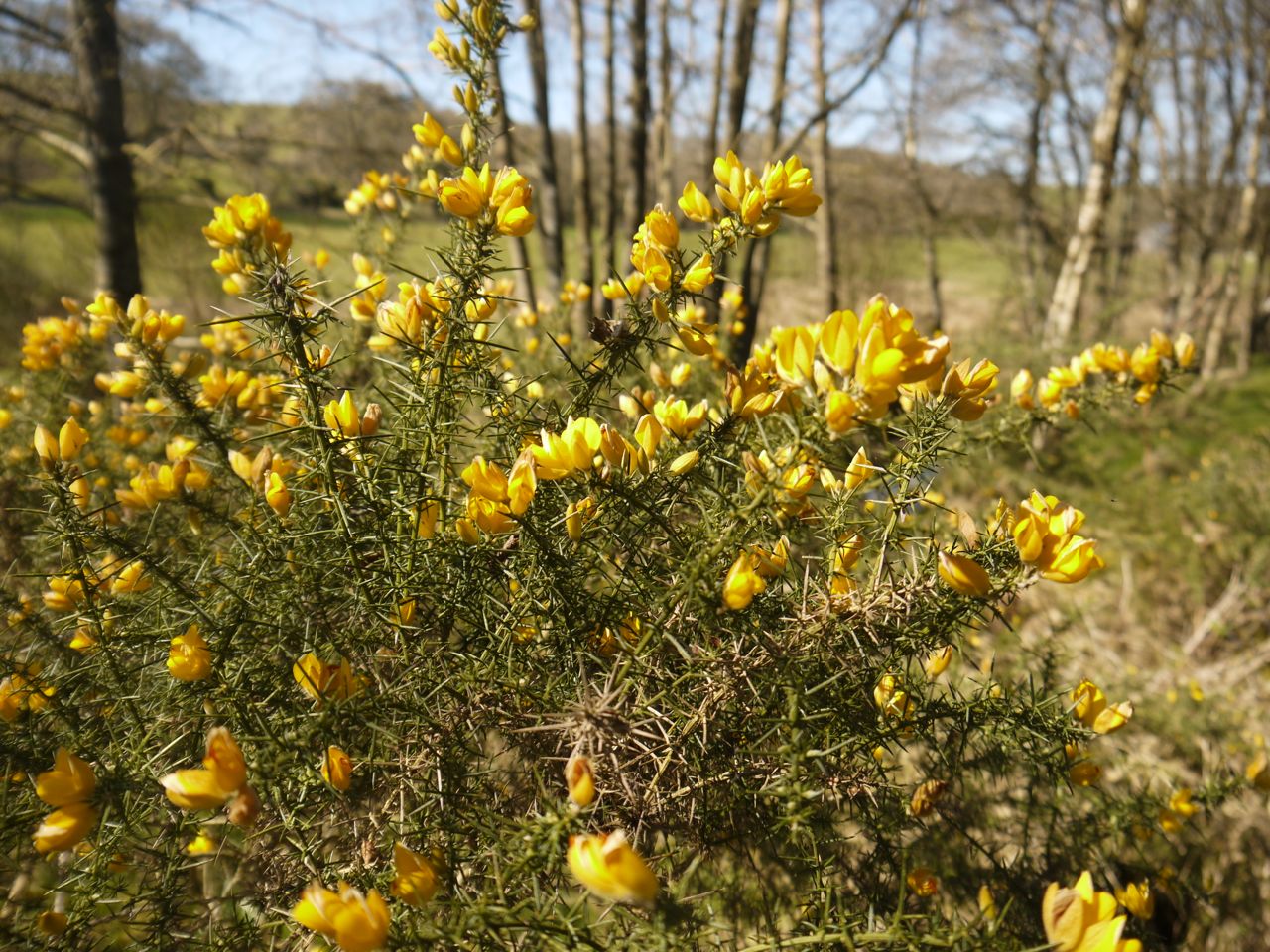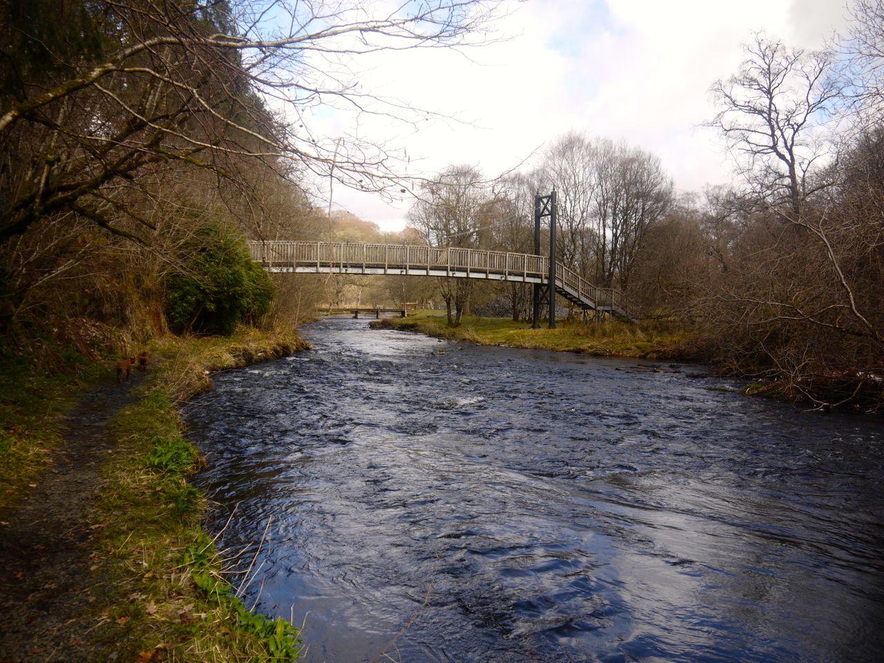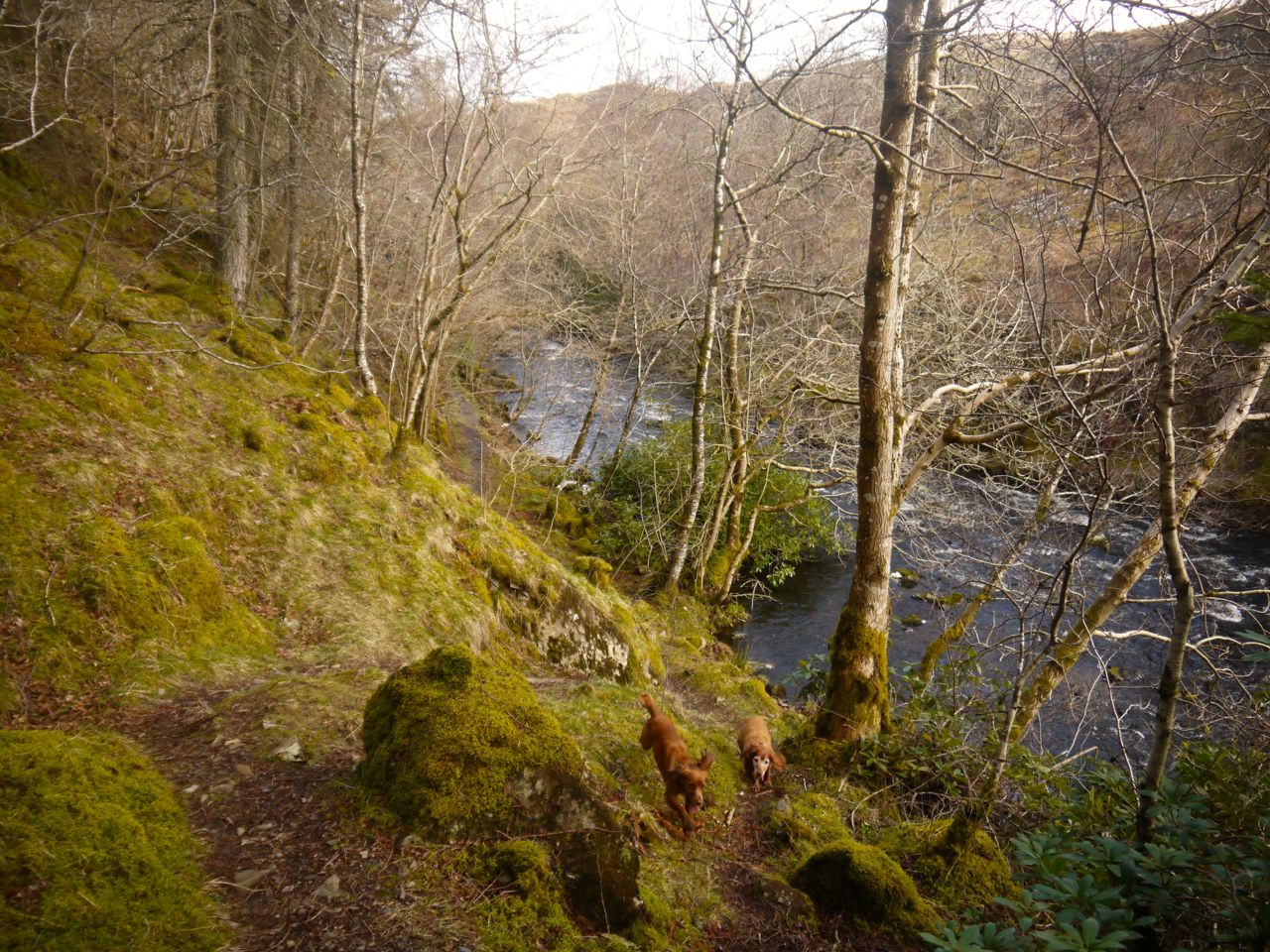 We strolled along the bank into the trees. The greens and browns supplemented with blue of bluebells, pink and white apple blossom and bright yellow broom. The three Rosnes Benches were among bluebells at the riverside and this time my camera’s white balance behaved. We could I suppose have wondered back and further along the bank downstream but with the forestry chaps working it wasn’t safe to have the dogs running near them.