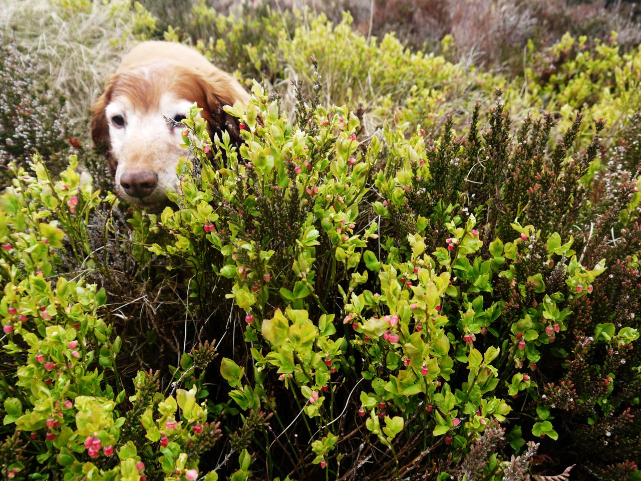 A large roe deer watched us then bounded into the trees unnoticed by the dogs, who also ran straight past an adder lying on the path. Eddie did though run after butterflies and small birds, or their shadows. When we came to stop for lunch we rested on a boulder among bracken on a slight rise above the path. Here Sweep’s snuffling turned into digging and he had a good go at pulling a root out of the ground. Eddie stuck with chasing shadows and when they faded as the sun passed behind a cloud he too took to digging for the lost shadows. He managed to wash off the mud a little later when he ran onto some moss that turned out to be floating on a pool deep enough to give him the full immersion treatment.
