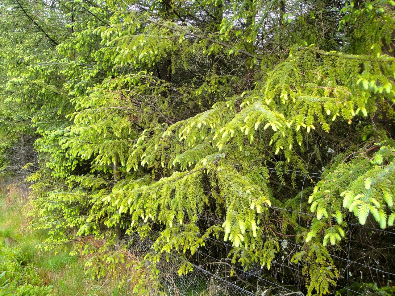 The next footbridge was a little before the uninhabited buildings at Moor. Here the Water of Deugh Trail crossed the bridge but I continued on the track towards Craignane. The track here was less used with fir trees encroaching upon it. The spruce had new growth of a much brighter green than the old needles and the pines new red growth, giving the trees the appearance of Christmas trees with lights.