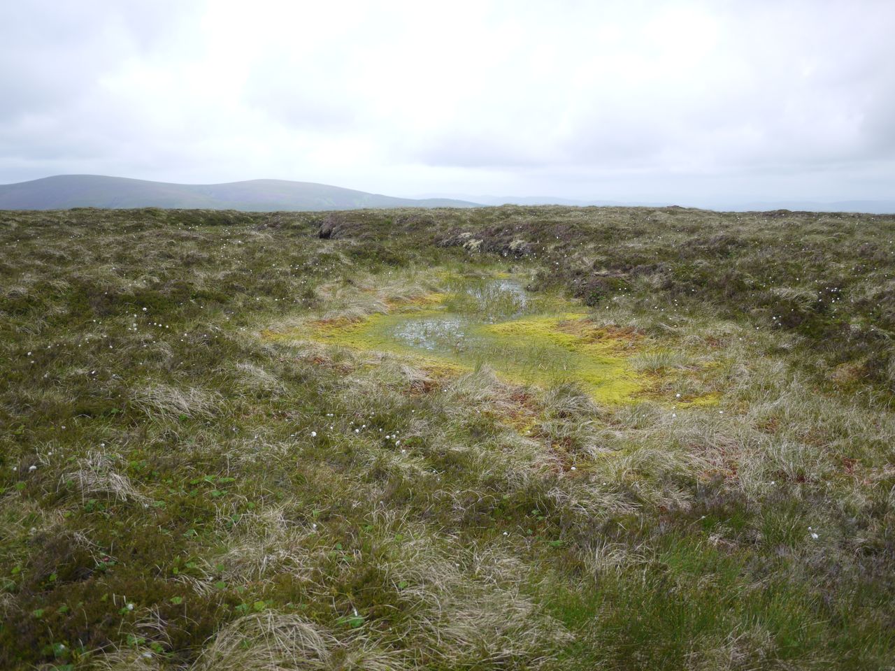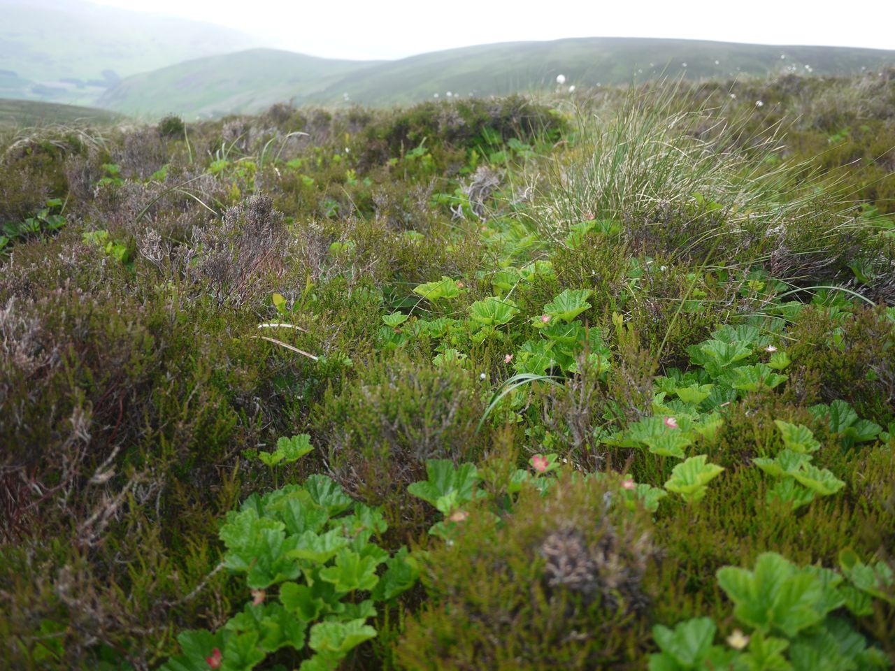 The going in this section was harder. The heather was deep, the mosses particularly sodden and the route littered with water filled ditches. It looks as if this had been triggered by vehicles on the fragile peat, but I can’t imagine anything other than tracked vehicles being able to move there. This was to be the terrain for many sections of the walk, not particularly difficult but extra work for the legs. I was surprised by the profusion of cloudberry and was at times walking over huge mats of green leaves amid the heather.
