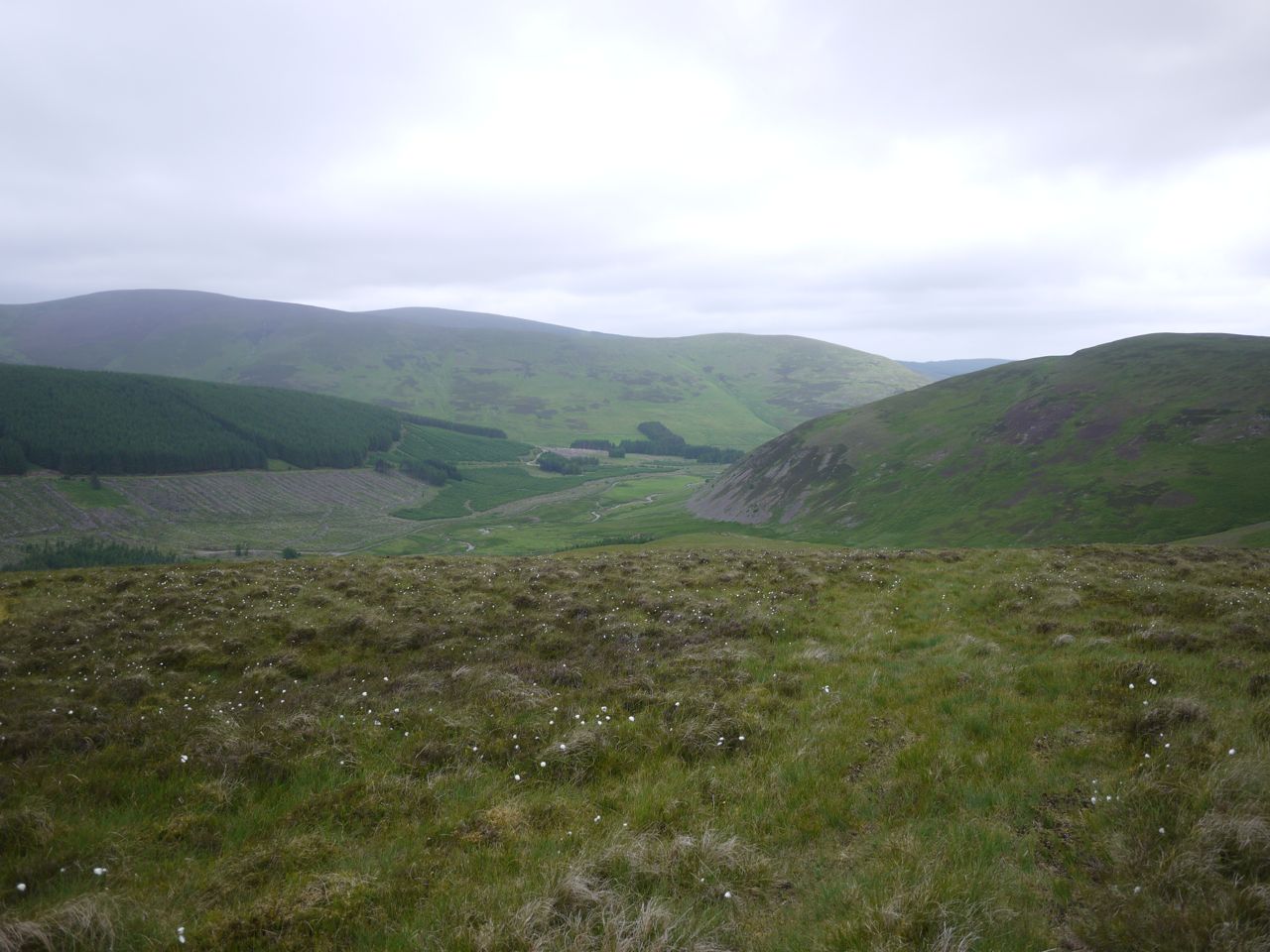 The trenches continued along to the SW top where I turned and headed down Sting Rig. Once over the hill’s convexity I could look down the rig and see a track though close up this was less easy to discern. The terrain and vegetation were not too bad though. I was caught out by a hidden hole which swallowed both of my legs to the knees so care was required. On the lower slopes, below a fence and gate I picked up a constructed path and followed that down to a shallow ford on the Linghope Burn.