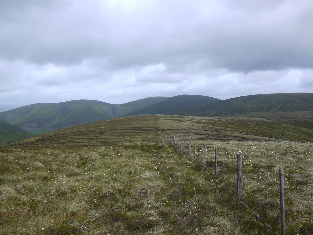 The walk over to Black Law was easy enough, just 1km of heather, cloudberry and cotton grass and 50m of gentle climb. Shallow parallel trenches run up to Black Law and along to its SW top, and looking back they also ran back up to Black Cleuch Hill. Immediately adjacent to the fence and too straight to be natural my first thought was that they must be vehicle tracks but they were too deep and spaced wrongly. They look more like the furrows you see in forestry plantations.
