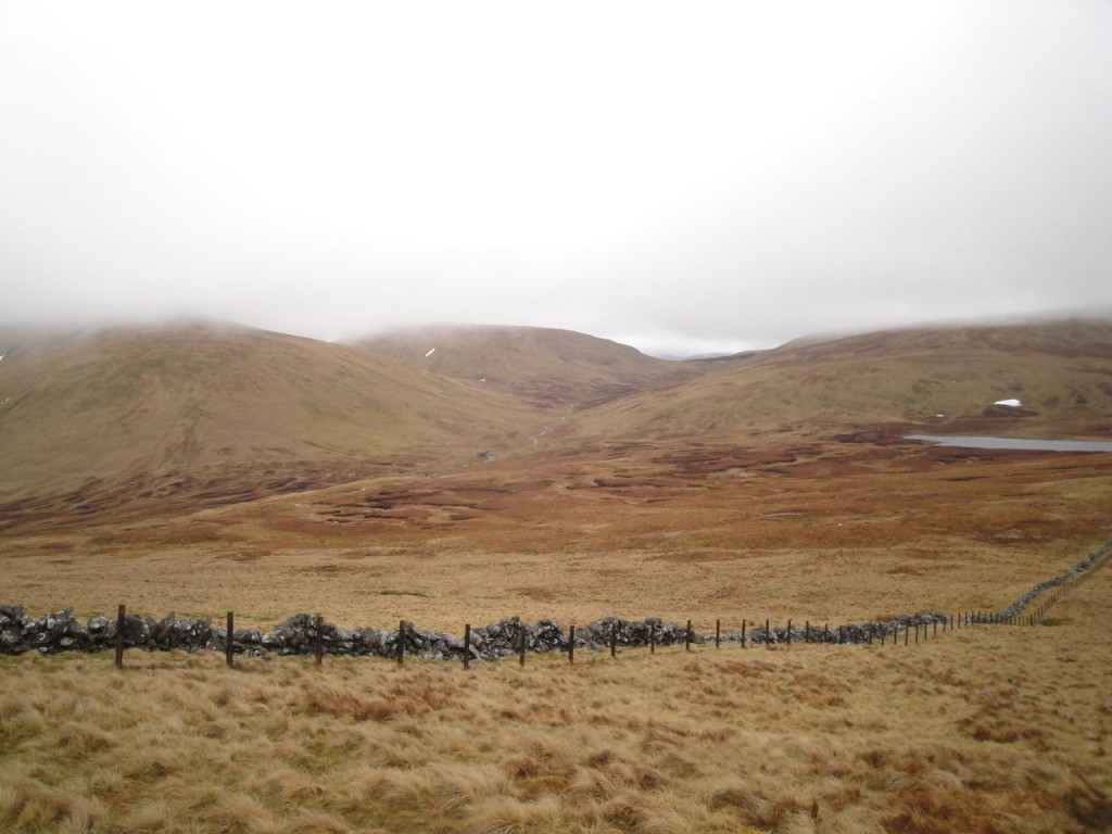 A bad weather day: drow ‘n’ smirr, with strong winds. I drove past the Menzion stones on the way in and parked at end of Fruid reservoir. In better weather I might have taken in Hart Fell, but for this outing my main target was to be Din Law.