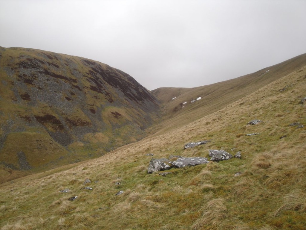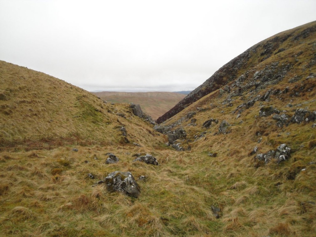 Ellers Cleuch would be an alternate route for descent but I didn’t know that until I was looking back up it. I had wondered at its name. Some sources suggest that Eller is Elder (as in Elderflower), while others say it is Scots for Alder (this source being more convincing). There are neither trees nor shrubs in the cleuch now but 7000 to 4000 years ago these hills would have been covered in trees such as Willow, Alder, Hazel, and Birch. The tree cover apparently began to decline about 5600 years ago with increased grazing, burning etc perhaps playing a part. The cleuchs would have been the last places that harboured trees, so perhaps Alders once survived in this cleuch. The Carrifran Wildwood project just a couple of miles away on the other side of Rotten Bottom is attempting to re-establish the ancient tree cover and Alders are being replanted there.