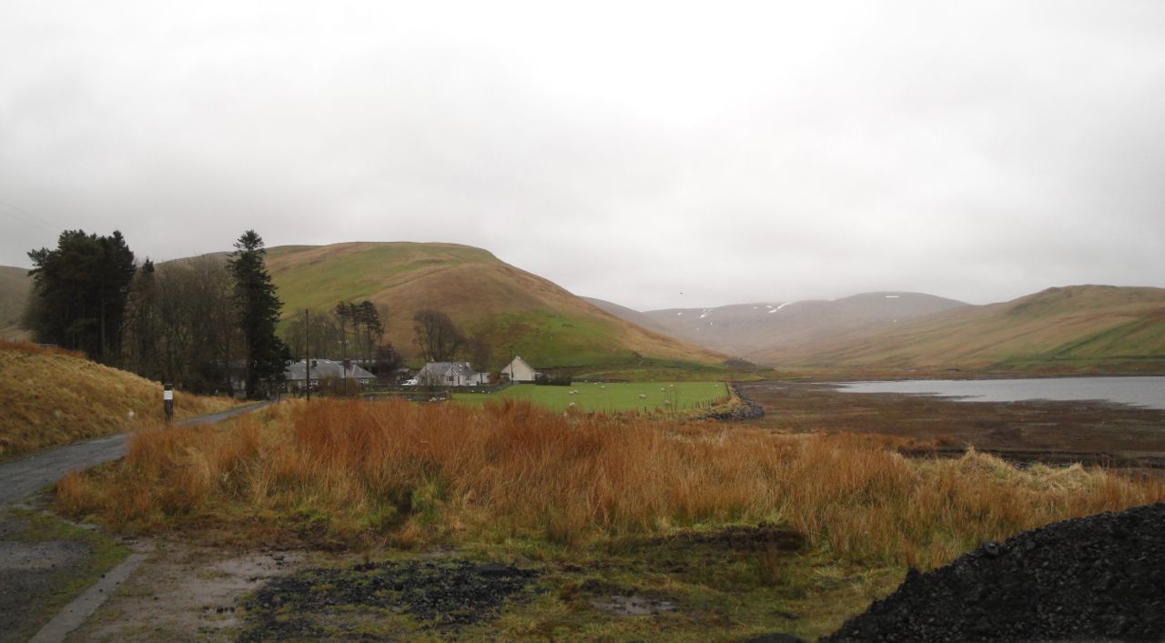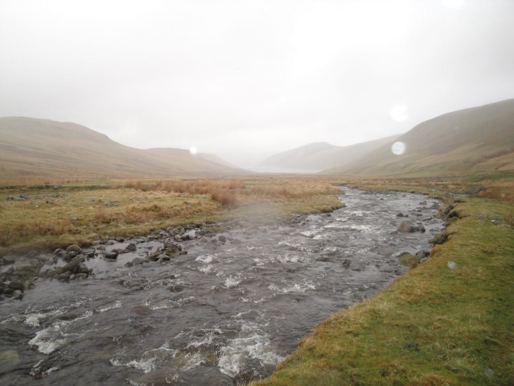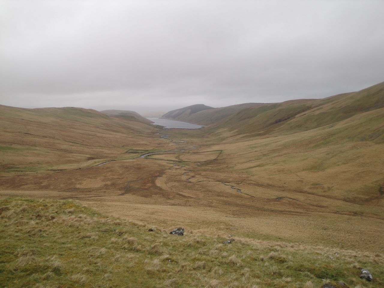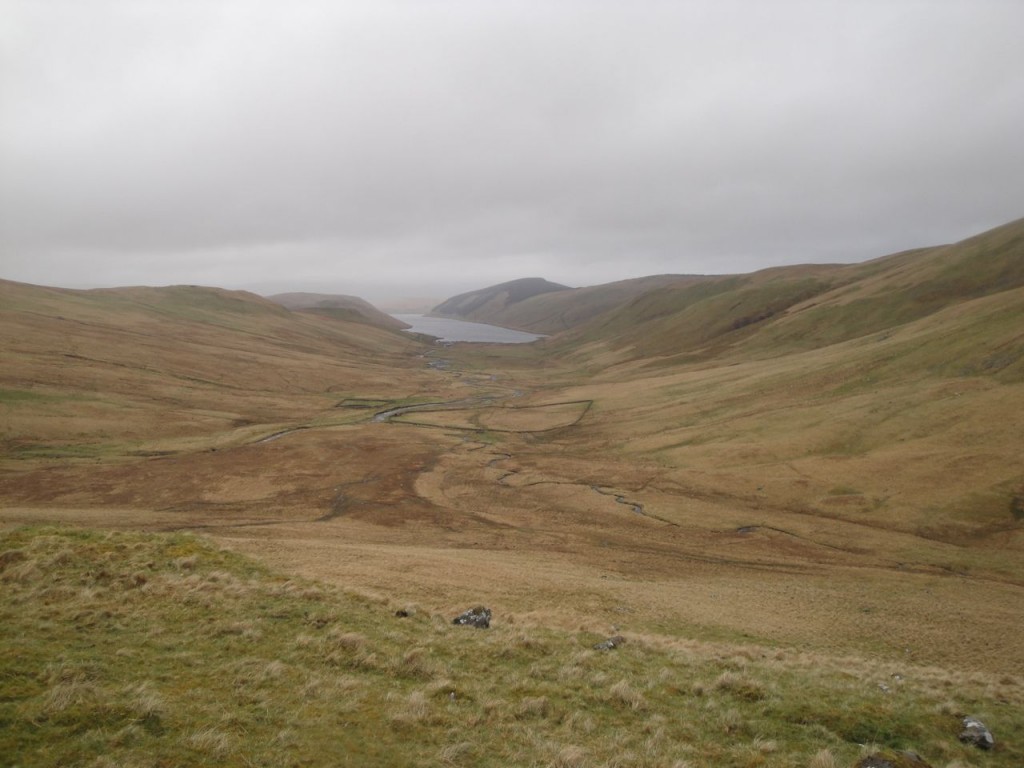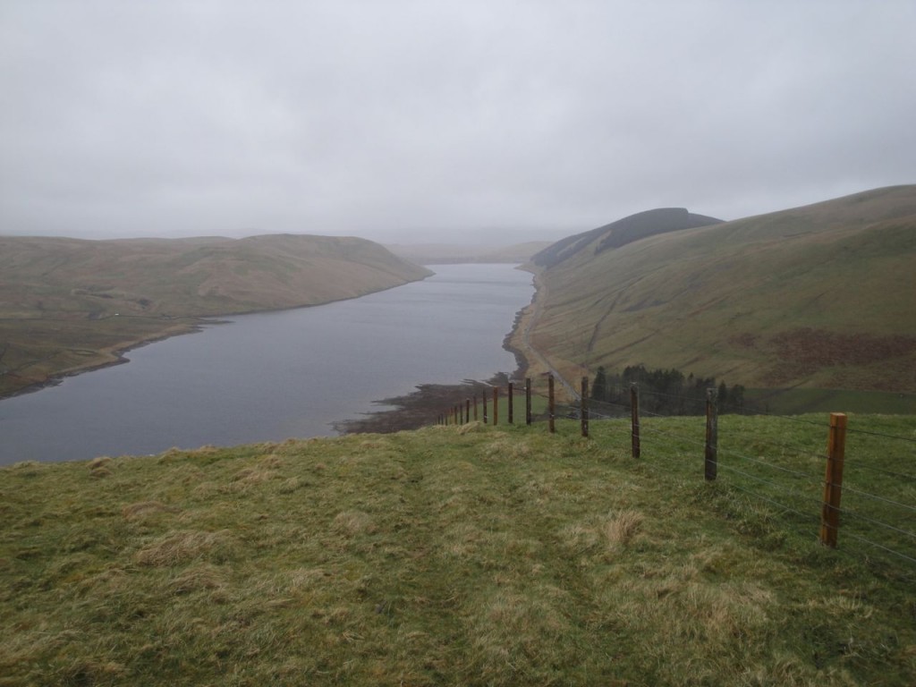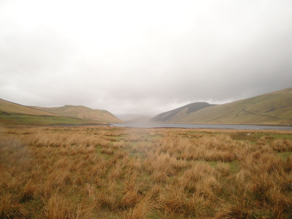 On the lower slopes of Din Law I found myself amongst the dreaded tussocks with their tangles of bleached leaves. The flatter ground between the base of Din Law and the end of Fruid Reservoir was too wet even for the tussock grass. The muddy ATV track wound over the firmer sections of this wetland. Numerous tributaries join Fruid Water, which itself follows a braided course. The ATV track led through the large sheep pen and followed the east bank of Fruid Water all the way to the reservoir, though on its way it crossed numerous small watercourses. Where the track met these it had usually eroded the banks to create wide fords, but narrower sections that I could easily step across were always only a few paces away. I had expected this last flat section to be very boggy indeed but it wasn’t too bad. Having said that I had wet feet by the end of the walk.