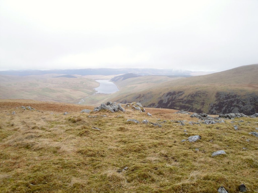So I followed the drystone dyke over the boggy section above Garelet Cleuch and up onto Ellers Cleuch Rig. The summit lies just over half way between the dyke and a pair of lochans. I set off from the dyke in mist on a bearing and counting my paces, but by the time I was at the summit the cloud had lifted again. Fruid Reservoir was just visible from the summit.