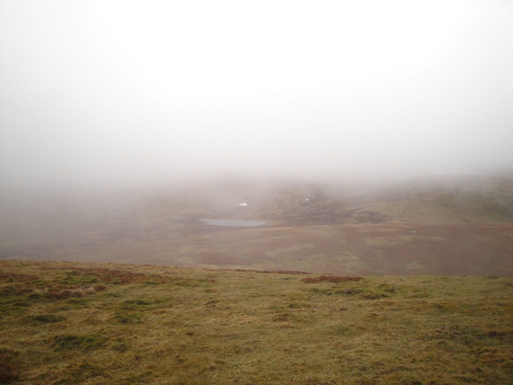 I parked near Fruid with the view in the photo above and headed directly up Strawberry Hill, beside a fence that is not marked on the OS 25K. The fence eventually turns away and an ATV track appears leading most of the way to Garelet Dod. Strawberry Hill was the larger of many shoulders on the western slopes of Garelet Dod, each offering a false summit horizon. The terrain on steeper section was grass and sparse moss, but less steep sections were waterlogged moss with numerous pools of water. The lower slopes had good views down Fruid reservoir, but higher I was in cloud (and rain).
