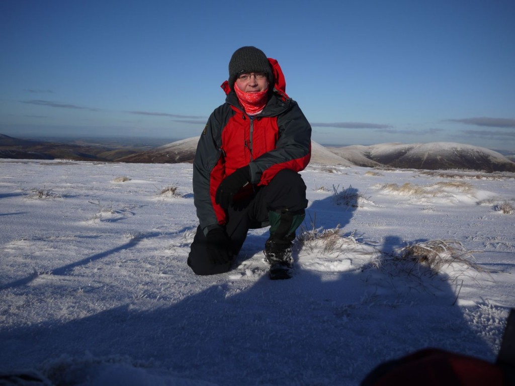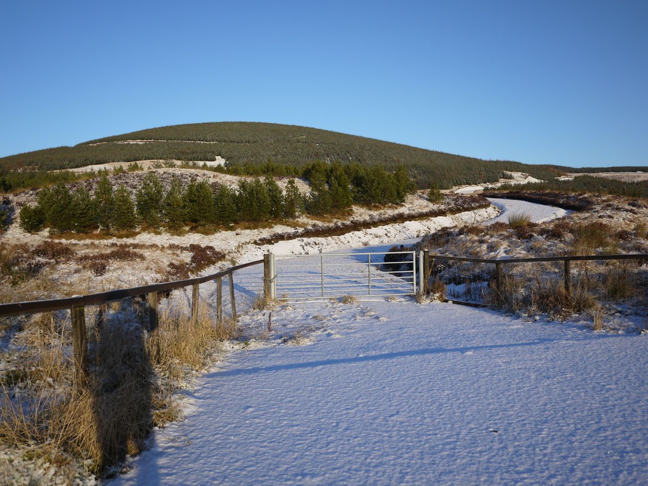 So I walked beside the ditch. The ground immediately downhill from the ditch had slightly deeper snow fully covering the heather giving the appearance of a path. But the ditch hadn’t finished taunting me. After a while it became wider, less deep, and broader. Since its base was free of heather, and apparently dry, other than snow, I found it was easier to walk in it. But before long it became narrower making it difficult to walk and then deeper. Once the edges were up to my elbow I gave up and climbed out. I took just short of an hour to cover 2.5 km above the trees.