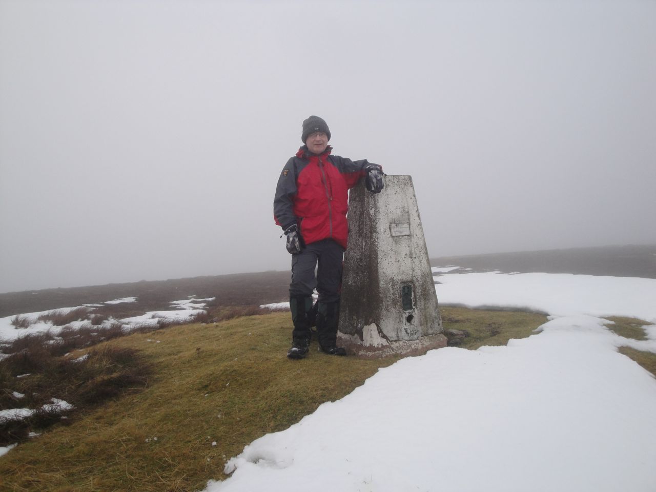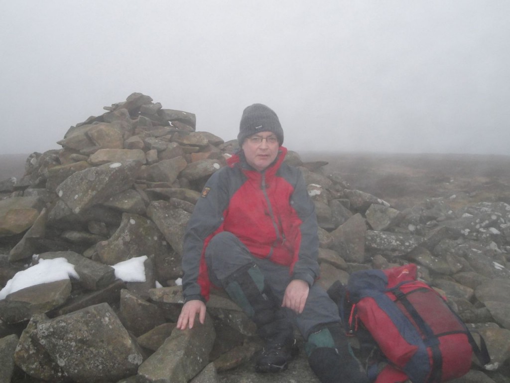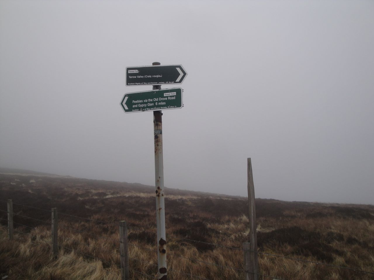 By Stake Law, the fence was reconstituted, the hags gave way to boggy heath and there were even boggy tracks to follow. In the middle of this wilderness (made more wild by the limited visibility of the mist) it was strange to see a sign post where the drove road crosses the Stake Law-Birkscairn Hill col. There was a stile there, and amidst the miles of bog this was a tempting seat for lunch (it could seat two). As it was, I had lunch sat on Birkscairn Hill’s large cairn. As I sat there looking about, in the mist, it seemed to me that the highest point was a little way NW of the cairn, so sandwich in hand I wandered across there. My phone, nestling in the rucksack recording the GPS log, didn’t capture this.