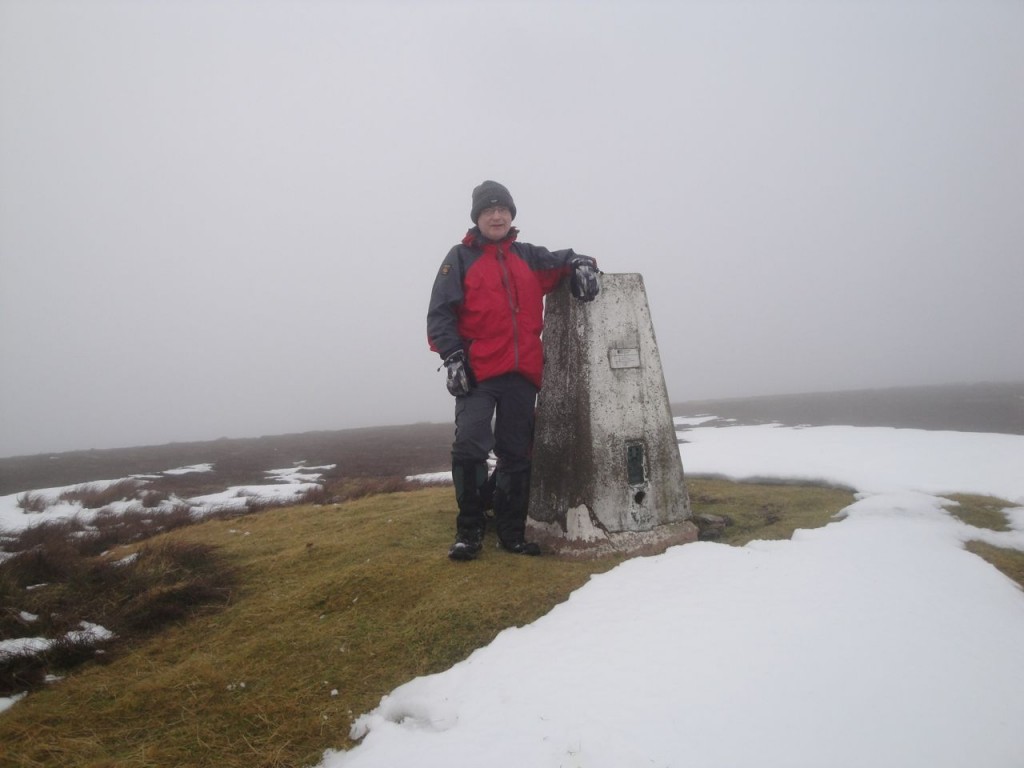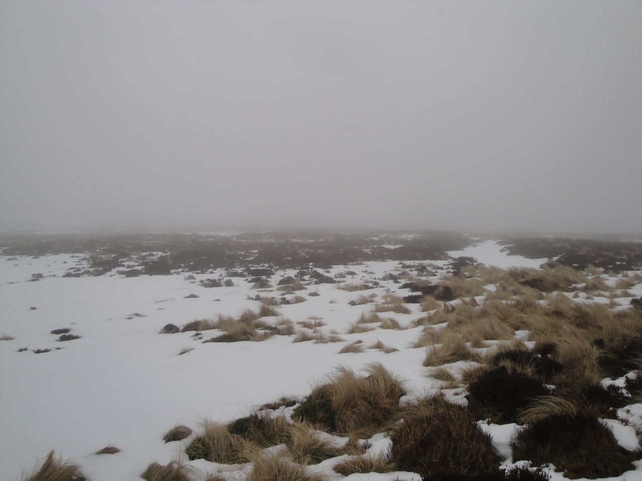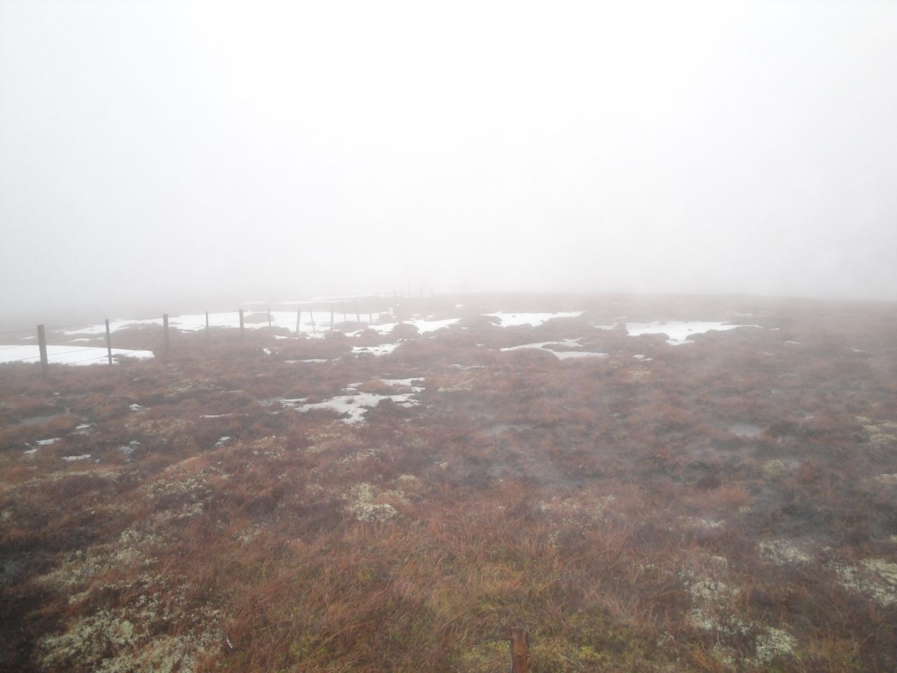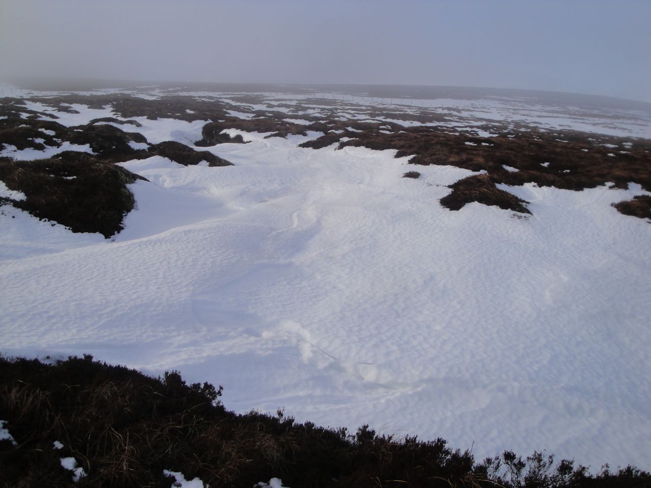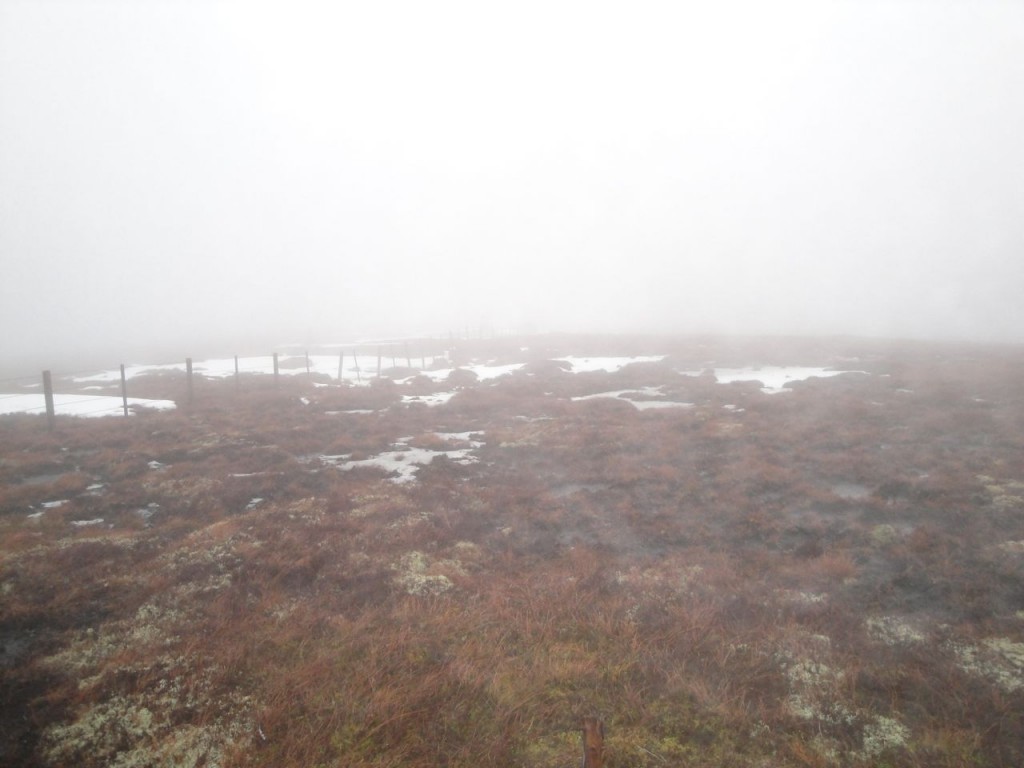 Once the gradient on Windy Neese eased the track became straighter, and swapped stone for bogginess, but the terrain and conditions became distinctly more unpleasant above 550m. By then I had climbed into mist; the track, which had become gradually fainter, ended at a line of grouse butts having led me into trackless deep heather interspersed with broad snow covered areas. Early on I had come across one of these snow covered areas with a hole revealing water beneath it, so I stuck to tramping through the heather where I could. I walked on for what seemed an eternity guided by my trusty compass. Time itself slowed down (my watch suggested half an hour had passed but it seemed much longer) and I might as well have been walking on a treadmill, since no matter how far I walked everything looked the same. Eventually after a very long half hour, a fence line appeared ahead out of the mist, the fence junction only a few metres away.