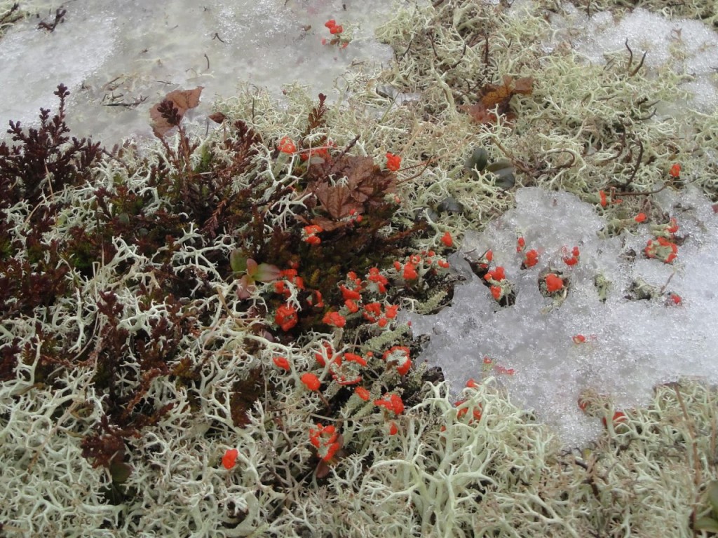 I had expected to find a track running along by the fence but if there is one it was lost beneath the snow. There was more bogginess but once I was on the rising slopes of Dun Rig the ground changed for the better. The deep heather and bog was replaced by firm ground covered in short mosses with numerous sprigs of cowberry. Amongst this mist covered white, green and brown was a single patch of orange, a scarlet cup lichen?