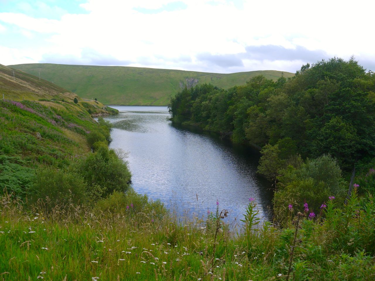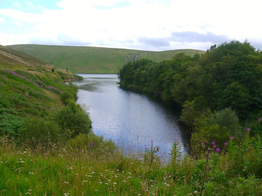 Half a mile later I was at Cramalt looking over the still waters of Megget Reservoir. The sun had now come out and I was warming up, so it was time to disrobe to the tee-shirt layer. I emptied my spare water bottle to save myself carrying the extra kilogram since I knew I had only 3.5 miles along the road (but uphill) back to the car. I hoped there would be something to make these last few miles more than just trudging along a road. The views across the reservoir were pleasant but once I had identified the various hills I soon grew bored. I had hoped there might be some birds to see (likely I thought) and I had carted binoculars around all day, but I saw none while walking by the reservoir. I could always hope to come across the olympic beach volley ball teams having a friendly game (very unlikely), but they weren’t there either. The one thing I could have hoped for, but did not even consider, came upon me without warning and was all the more pleasurable for that.