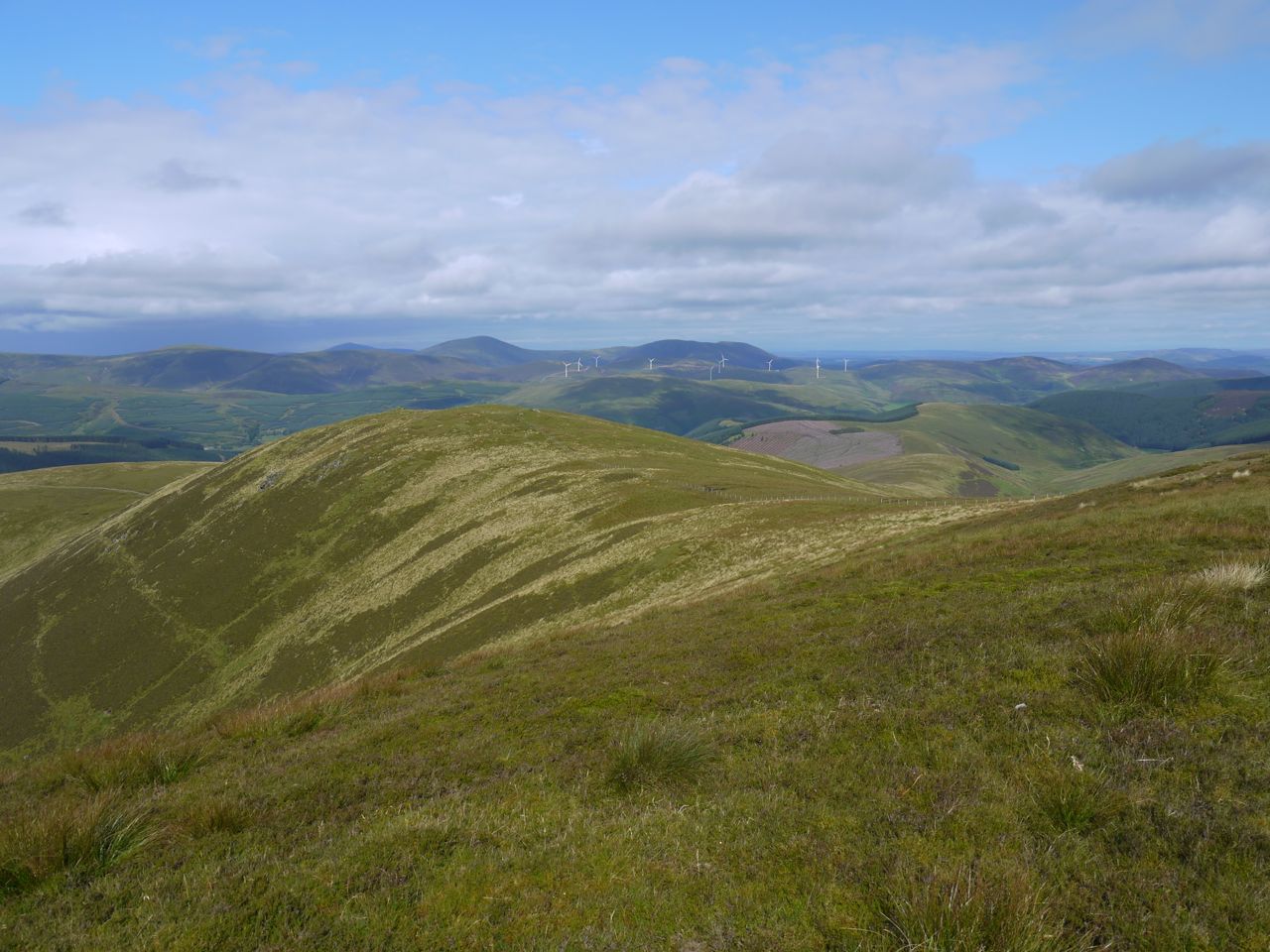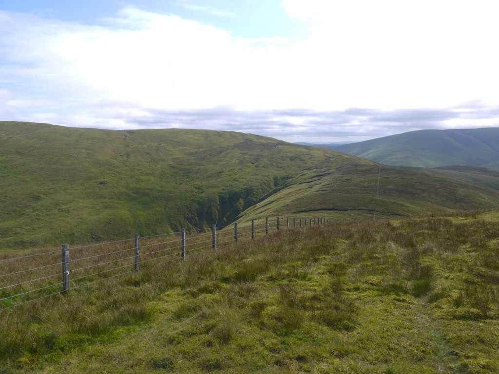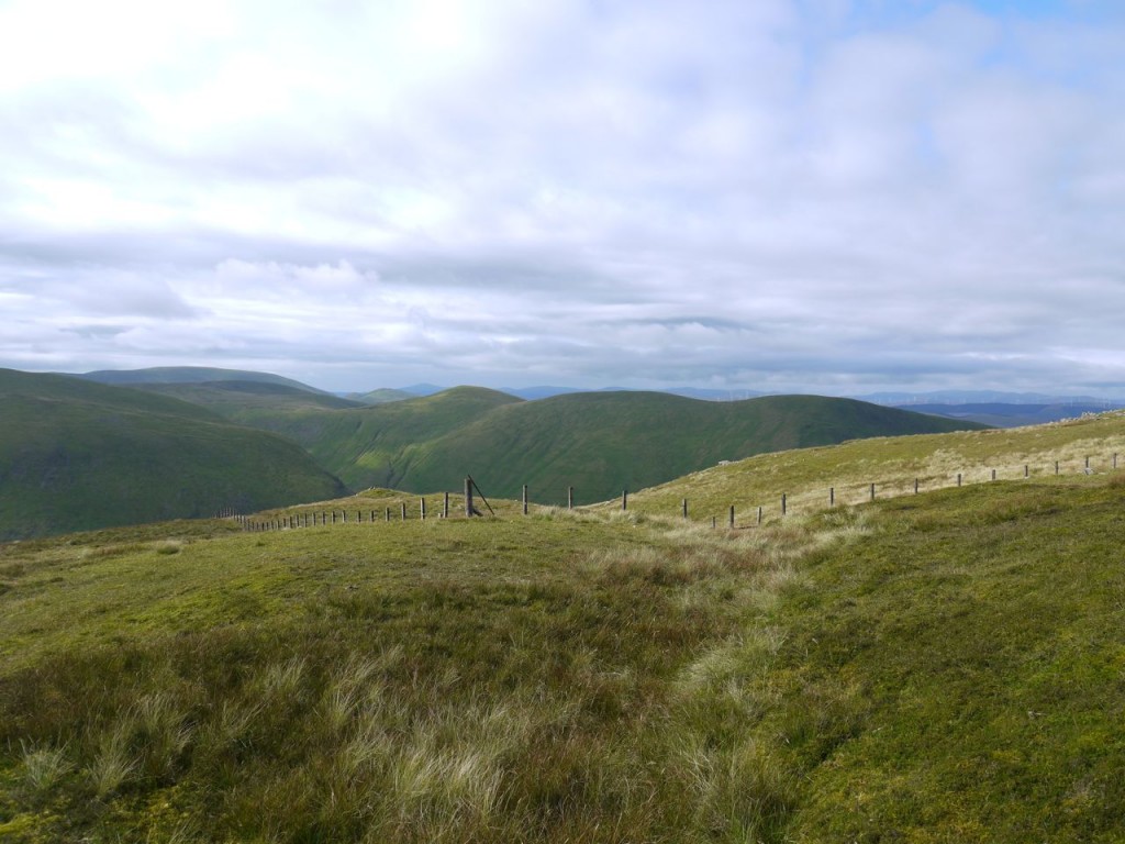 From Cramalt Craig the route ahead is visible all the way to Dollar Law. This is an easy enough walk across short grass, albeit somewhat squelchy in places. There is in fact an obvious track heading from Cramalt Craig that looks to have had substantial vehicles on it. This eventually turns off to the right whereas my route followed the fence over Dun Law and Fifescar Knowe to Dollar Law. The ridge and Dollar Law itself have great views of the adjacent hills.