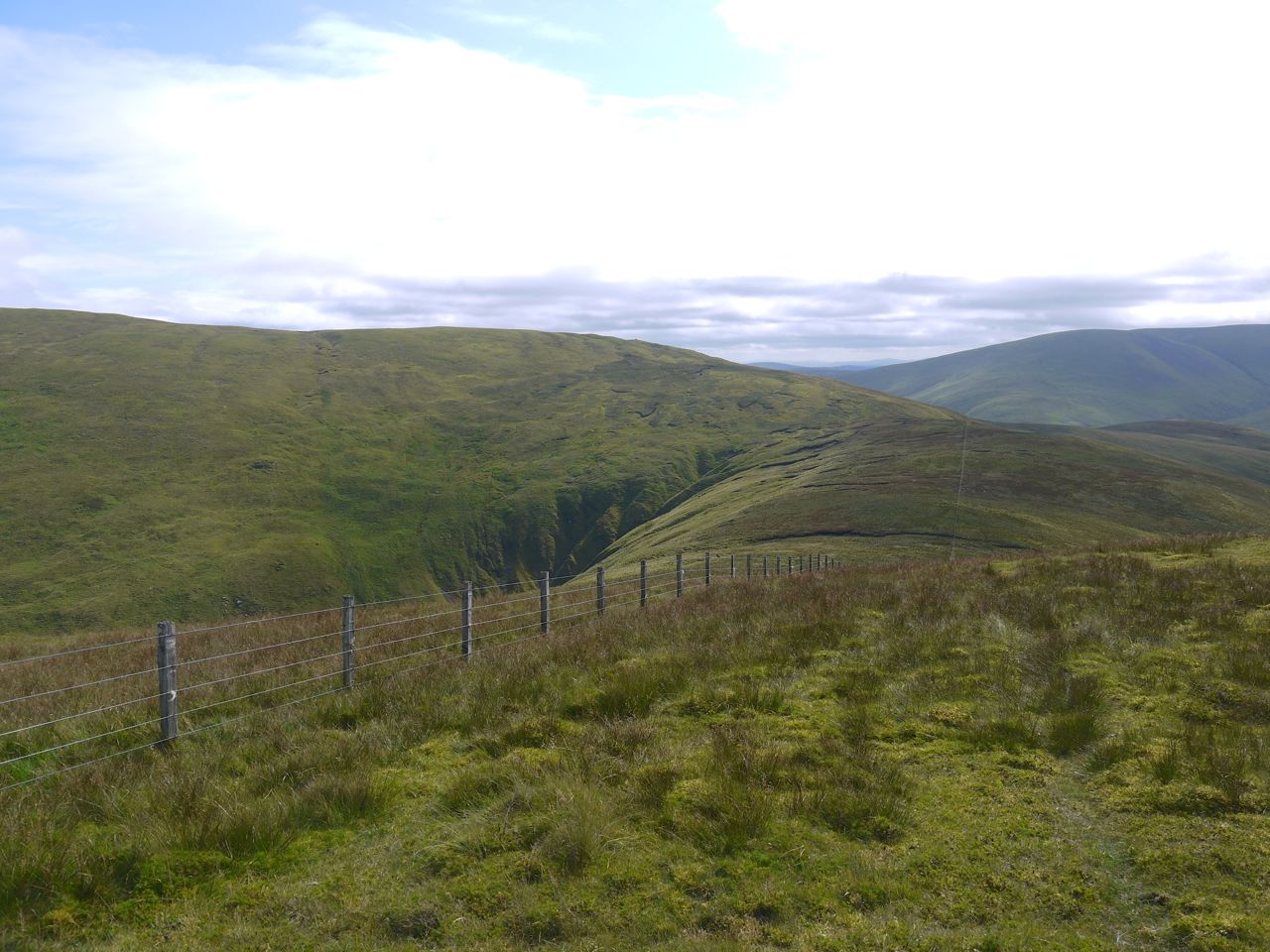 There is a dog-leg in the fence a little way before the fence junction. That I had failed to remember. As I approached the left hand bend of the dog leg, the aerial atop Broad Law came into view and captured my attention. There was a very faint trail continuing up the hill towards the aerial, clearly cutting across a a dog-leg in the fence so I continued along it. Unbeknown to me the fence to Talla Cleuch Head was attached to the dog-leg and hidden behind a slight rise.