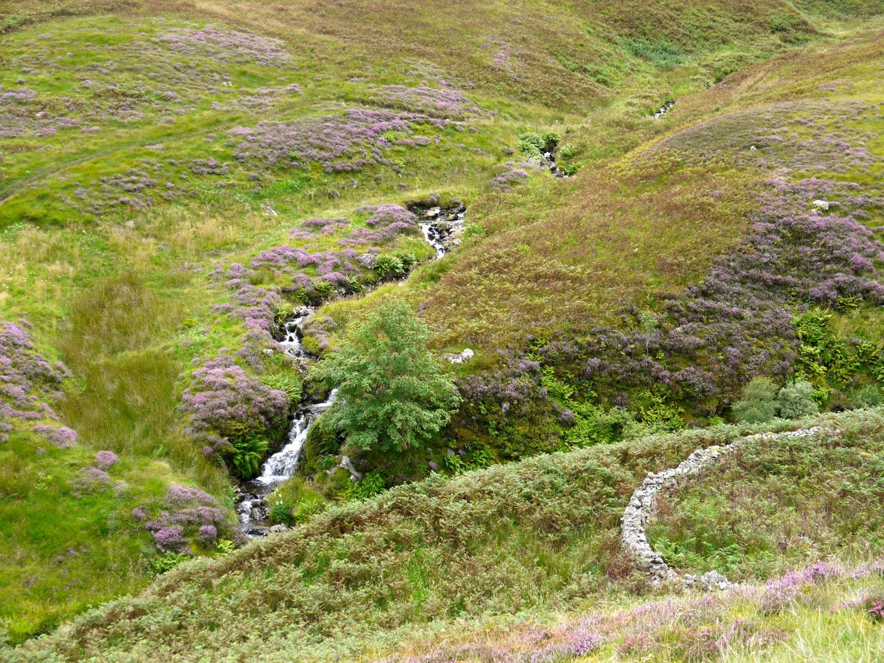 One particularly pretty area is at a sheepfold where waterfalls of Wolf Cleuch burn join Cramalt burn. The sheepfold nestles amid tall grass, a single tree overlooks the burn, the hillside’s many shades of green are mixed with patches of purple heather, and there is the sound of the waterfall.
