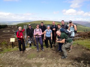 The walk over Brown Knowe and Broomy Law was easy going on good paths with excellent views and the Eildons getting closer. The Three Brethren came into view from Brown Knowe and did look to be far distant, but came gradually closer. The path up does look steep but once we got to it, it did not seem as bad. In fact by this time I had already realised that age is catching up with my knees and I prefer slight inclines to downhill sections. Poor Graeme was hoping for a portaloo at the top but was to be disappointed. We were told that there were just ten miles to go to the end and two to the silver finish, the latter all downhill. The stop allowed Joanna to tend Bobbi’s blisters, and the rest of the team to have a well earned rest.