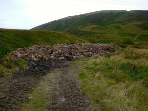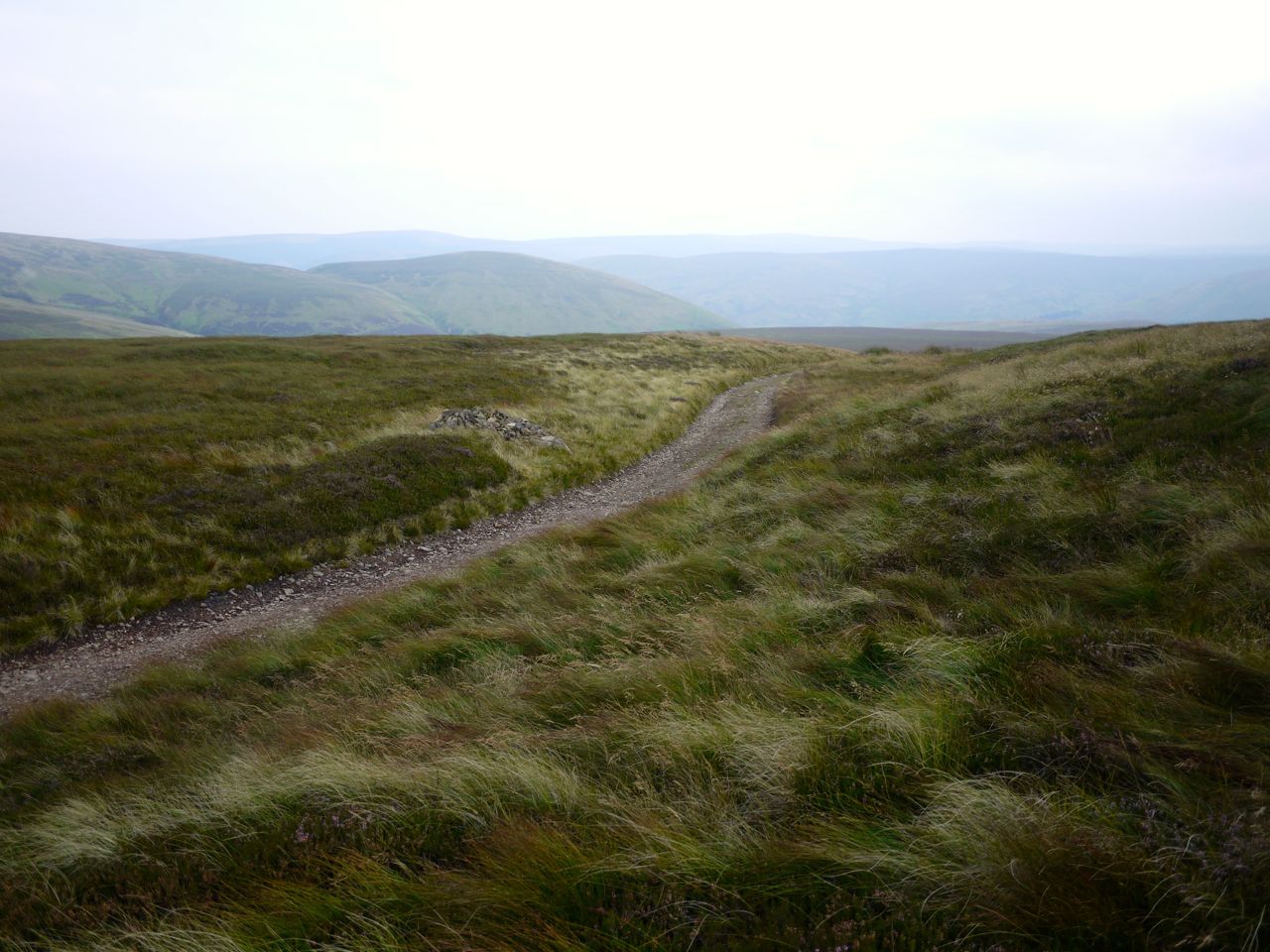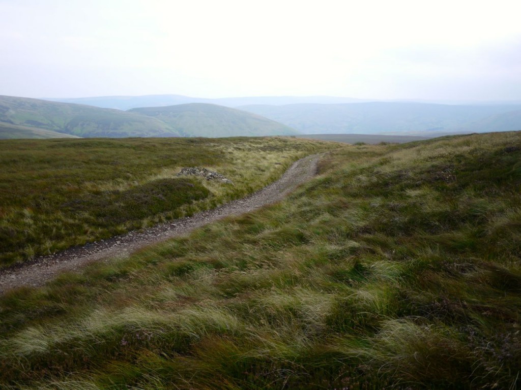 From the summit my plan had been to head for the pile of stones marked on the map and then towards a sheepfold where I would join the path back to the Megget Road. Unfortunately given the shape of the hill, I could not see the pile of stones and since the actual summit is unclear it was difficult to use a bearing, so I headed off perpendicular to the fence. The pile of stones was nowhere to be seen, though in retrospect (inspecting my GPS track) these were the cairn I had passed on the way up. I eventually came upon a vehicle track that I followed all the way back to the Manor-Megget path, close to the sheepfold.