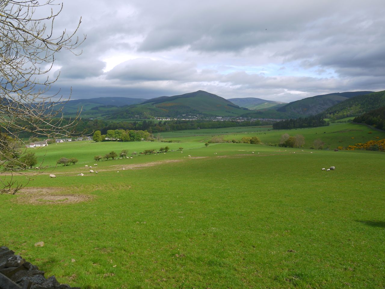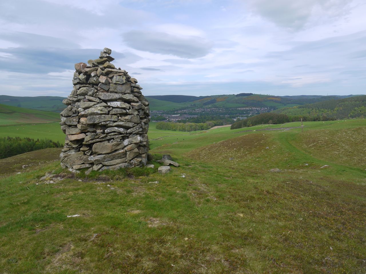 Once over the brim of the hill we could see the Eildons again. The fields here have piles of stones which are apparently “clearance cairns”. A large cairn marks the point where Gala comes into view and the hillside nearby has “Focus Judo” spelled out in stones, Focus Judo being a local club.