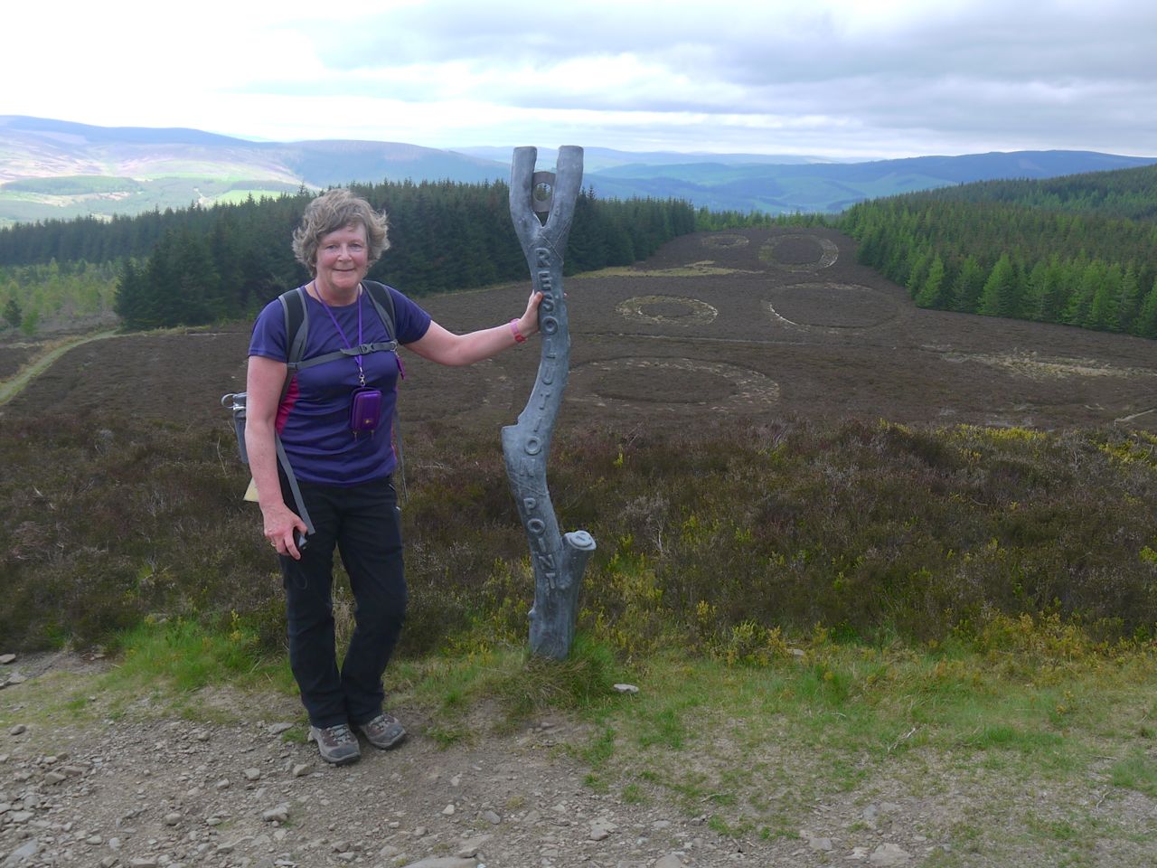 After 280m of the 360m climb we rejoined the Old Drove Road. Here there was a bench occupied by recovering mountain bikers, and the viewpoint for the Point of Resolution sculpture. This is made up of several “circles” cut into the heather of the hillside. These are actually elongated ovals, the largest measuring 150m by 30m, which appear circular from the viewpoint. This natural artwork was completed in 2005 and I wonder if the circles have to be recut as time goes by.