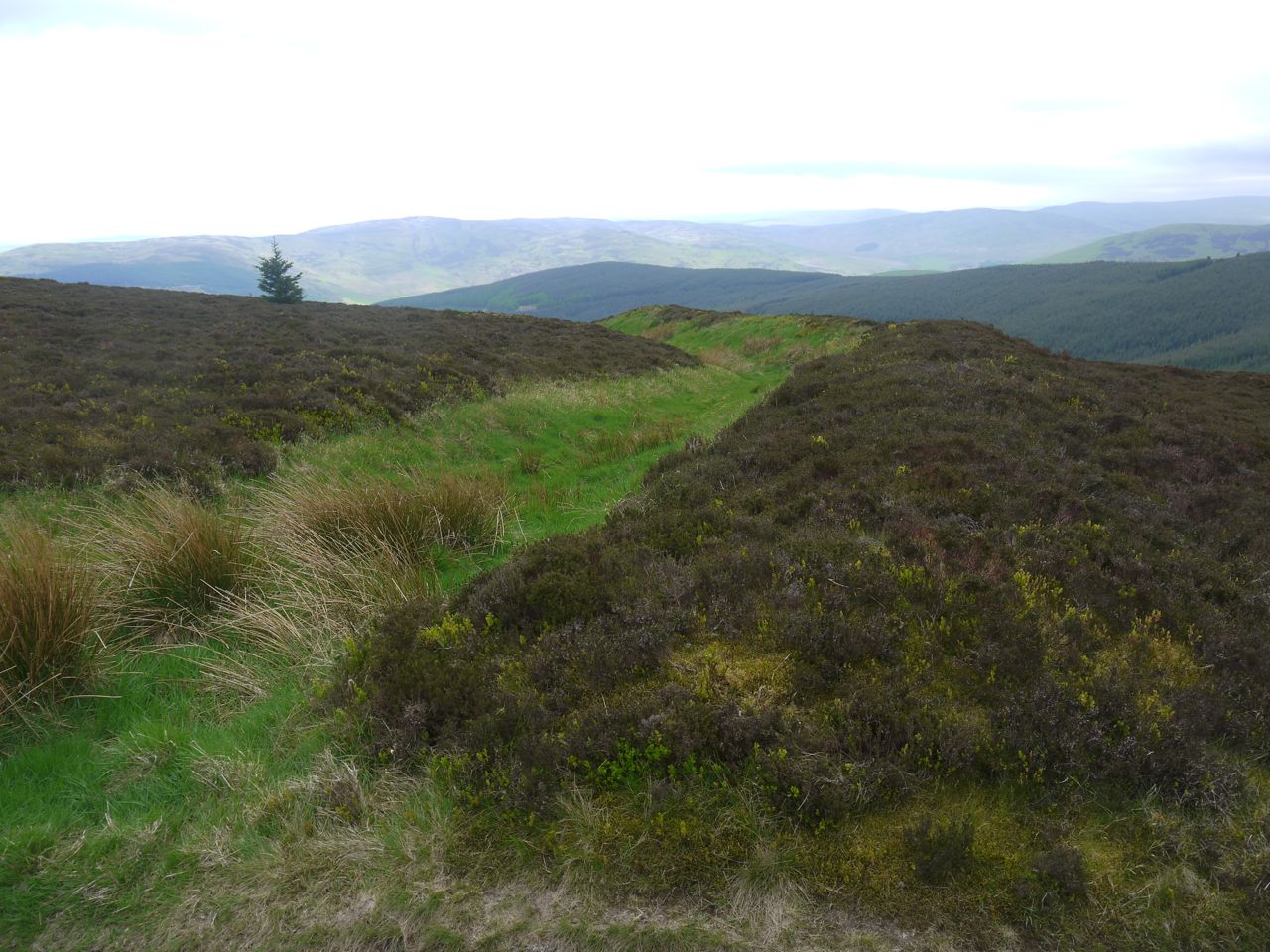 After Hare Law we left the forest for moorland, walking along the Drove Road up to the Brown Knowe. The path did look quite steep from a distance but strangely it seemed much more gentle once we got there. The path passes through Wallace’s Trench. The original purpose of this earthwork is unknown and it is not certain that Wallace had anything to do with its construction. Given how much remains even now I presume this must once have been a substantial construction that blocked the passage across Brown Knowe, there being marshy ground to the north and steep hillsides to the south. The type of construction suggests it was defence against a force from the west.