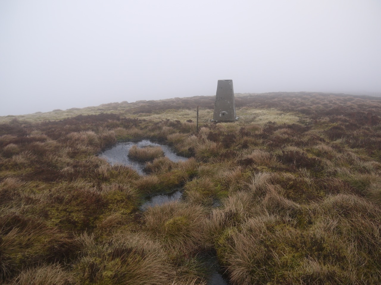 The ground here was boggy in places but with enough firm ground to find a way. Wester Rig meets Long Moor at a tree line and here I turned up towards The Wiss. This ridge has a more gentle gradient but rougher terrain with sunken boggy sections to avoid. As I continued to climb the cloud came down to meet me.