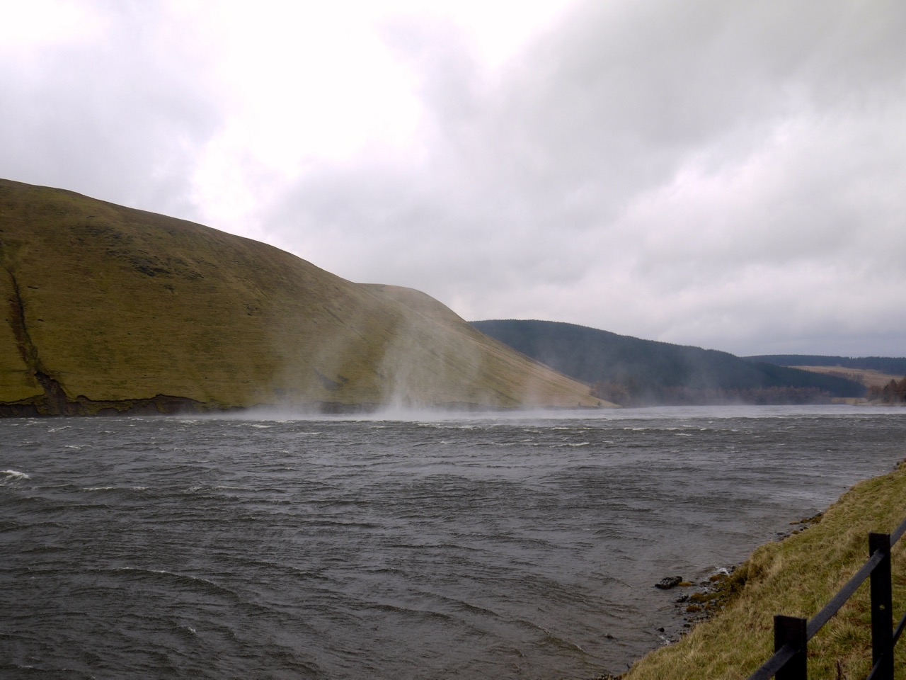 Heading back the waters of St Mary’s, Megget and Talla had tall spouts of spray blown up from the waves, and in places these looked like whirlwinds. I stopped to get a photo and found it very difficult to close the car door because of the wind.