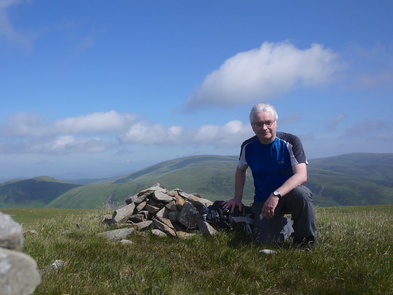Carlavin Hill had a small cairn and the stone wall running along to Molls Cleuch Dod ensured there was always somewhere to sit during rehydration breaks. Throughout the walk there were great views of the Moffat hills and the southern Manor Hills. At Molls Cleuch Dod there is a small cairn about 50m from the wall and a larger one by the wall. There is also a small hollow by the wall that would be a useful shelter when it is windy. The wind had in fact picked up enough to force me to put on a jacket but not enough to take to the hollow.