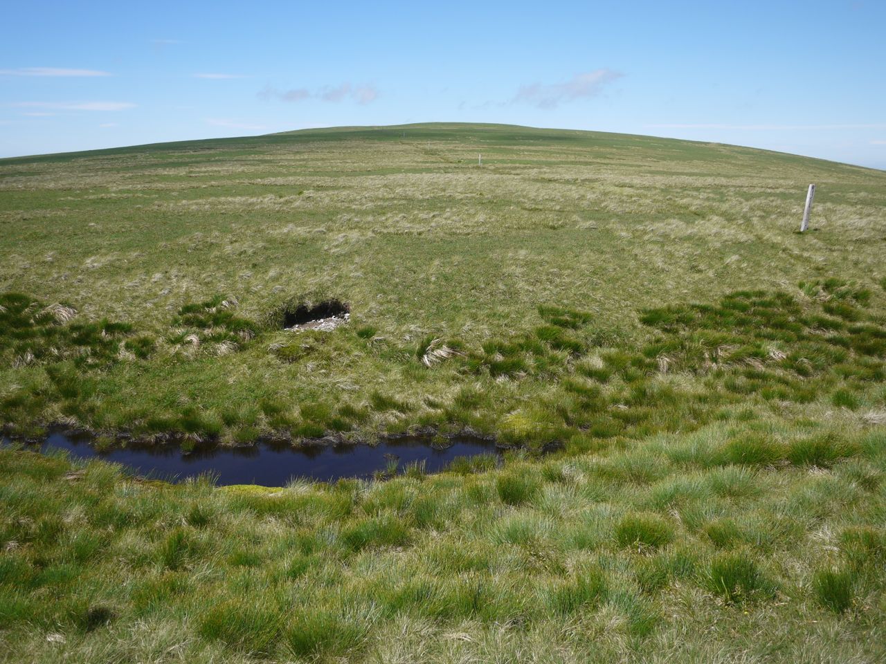 I followed the wall up to Firthybrig Head and then along to Donalds Cleuch Head, Firthhope Rig and White Coomb. You could easily miss Donalds Cleuch Head, the gradients being so mild, if not for the fence posts heading off towards Great Hill. The wind was blowing directly in my face as I walked the southwesterly part of this dog-leg, and the wind was aware of my thoughts. Just as I was thinking that the wind required increased effort but was not impeding my progress, I was struck by a sudden strong gust that stopped me in my tracks. Luckily it didn’t happen again.