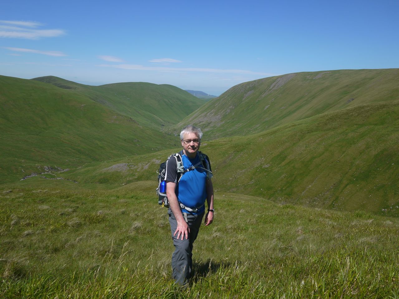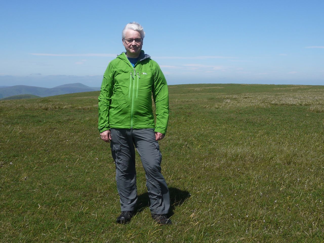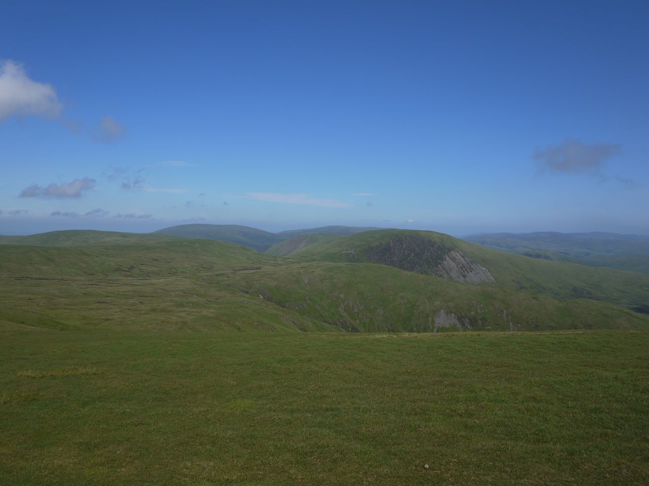 This slope was grassy steps with scattered rocky outcrops. Some short sections were steep enough to allow hand use without bending but nothing really worrying. Once the the crags gave way to the grassy plateau, the gradient eased and was much easier on the legs and lungs.