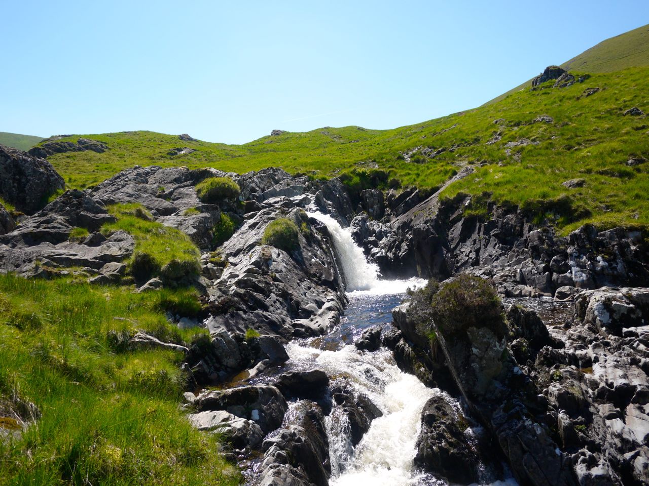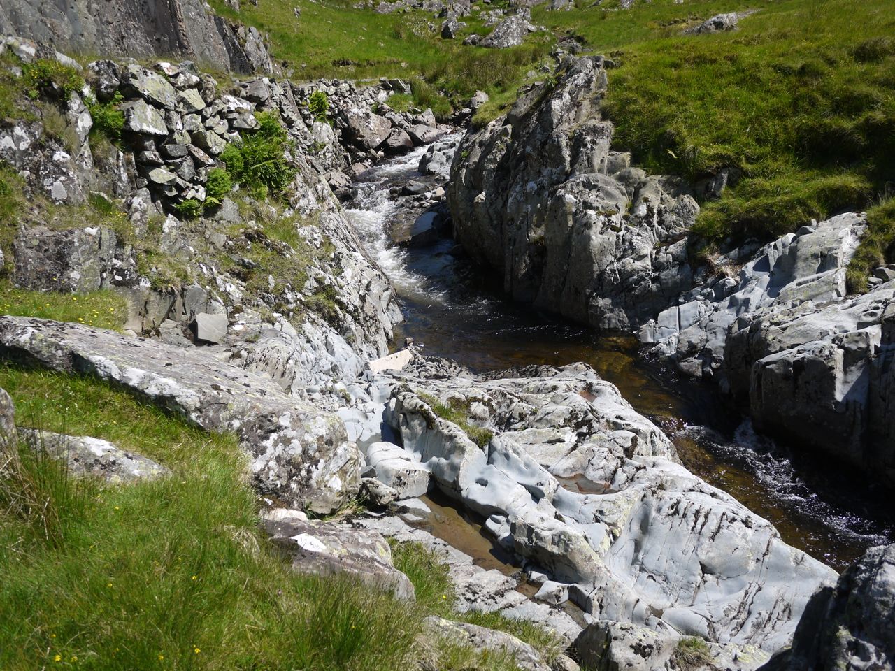 The Gameshope Burn has several small waterfalls and gorges so I decided to treat myself to some water therapy. I found a smooth rock to sit on, took off my boots and socks and soaked my feet in the chilled water. looking about I could see that the water level would at times be higher than where my head was. I can see how this burn washed away its bridges.
