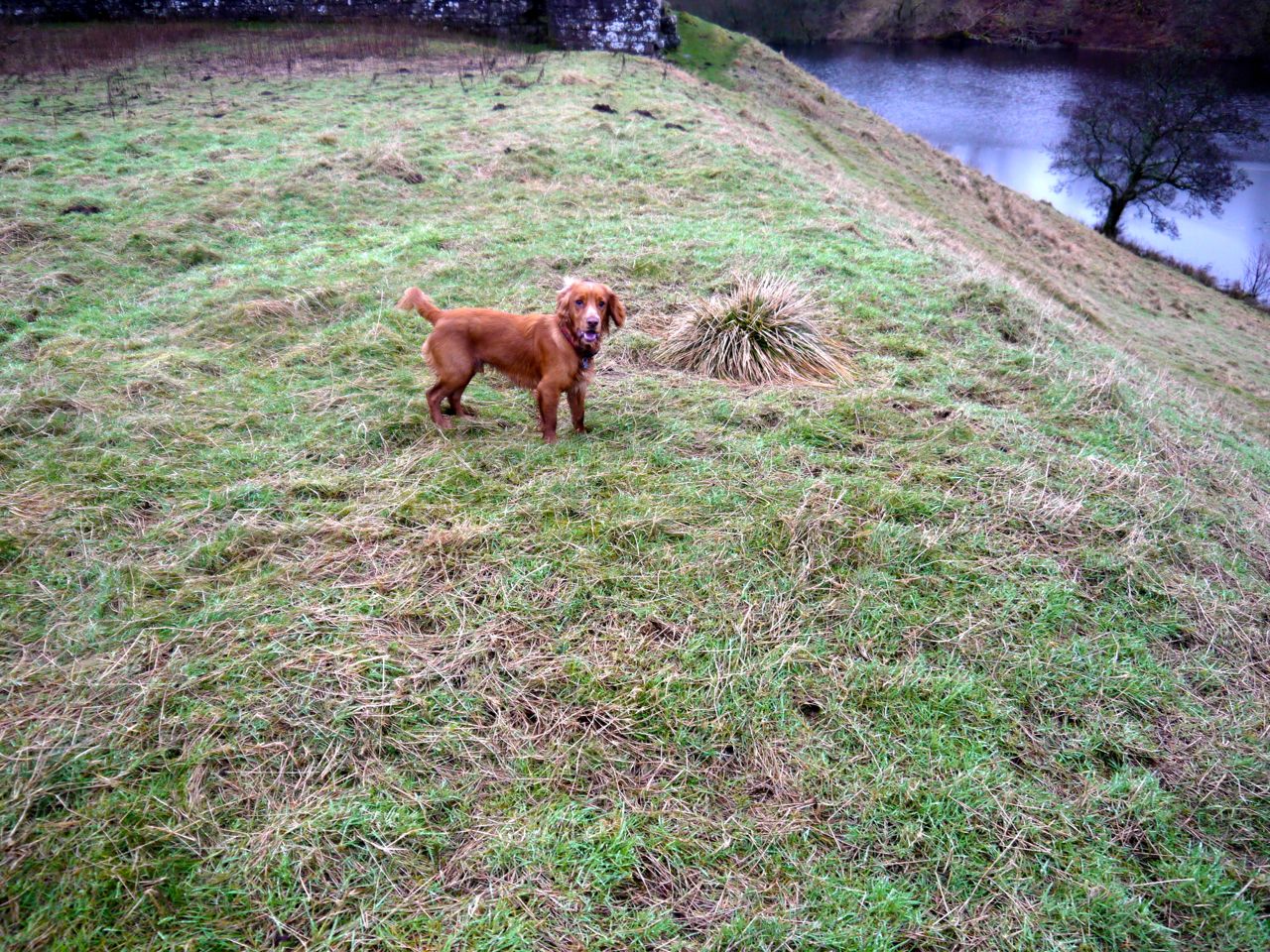 After exploring the castle we headed back to the entrance gate to cross the road into the woods. The kissing gate, as seems usual, swung over a dirty puddle of uncertain depth. Since the dogs went before me I was forewarned to step around its edges.
