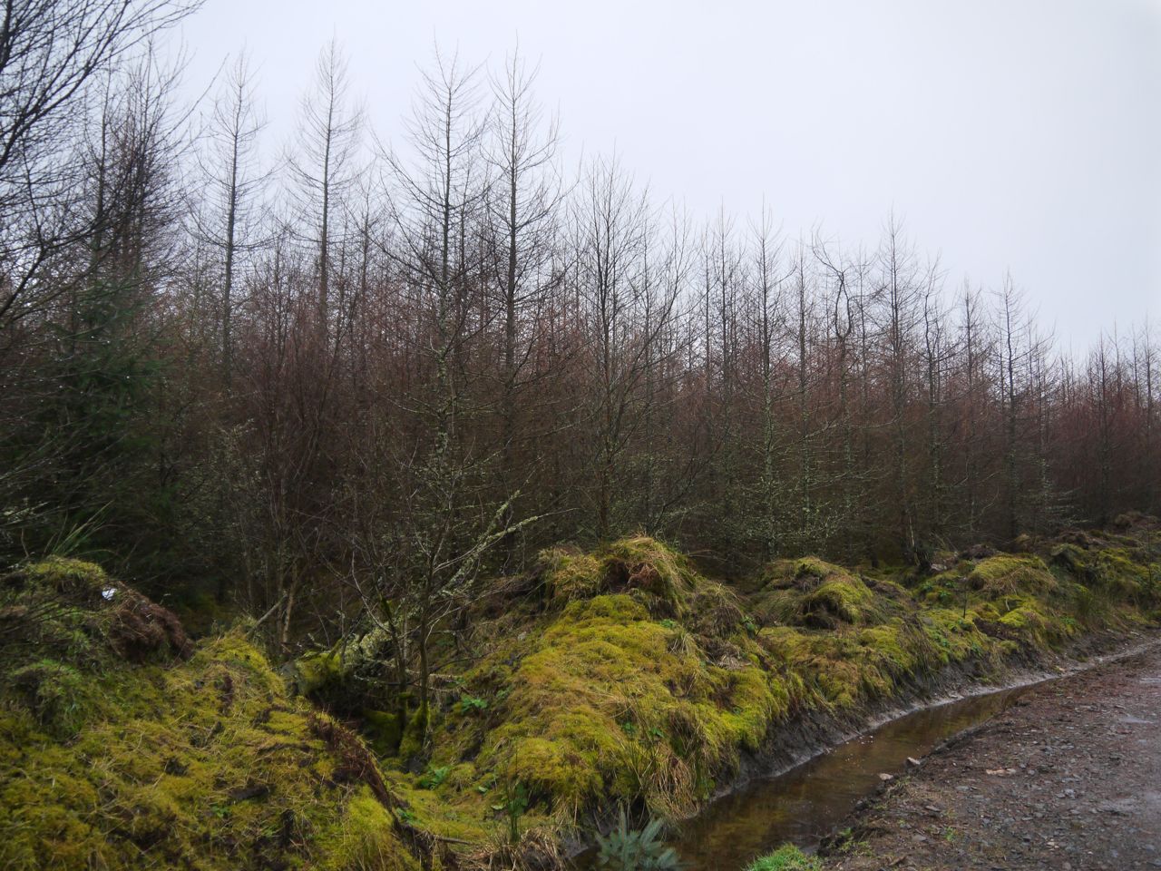 The dogs enjoyed splashing through the puddles and running into the woods, while I picked my way around puddles. We spent the early part of the walk on forestry tracks through a piety of woodland: young conifer, some deciduous and felled wasteland.