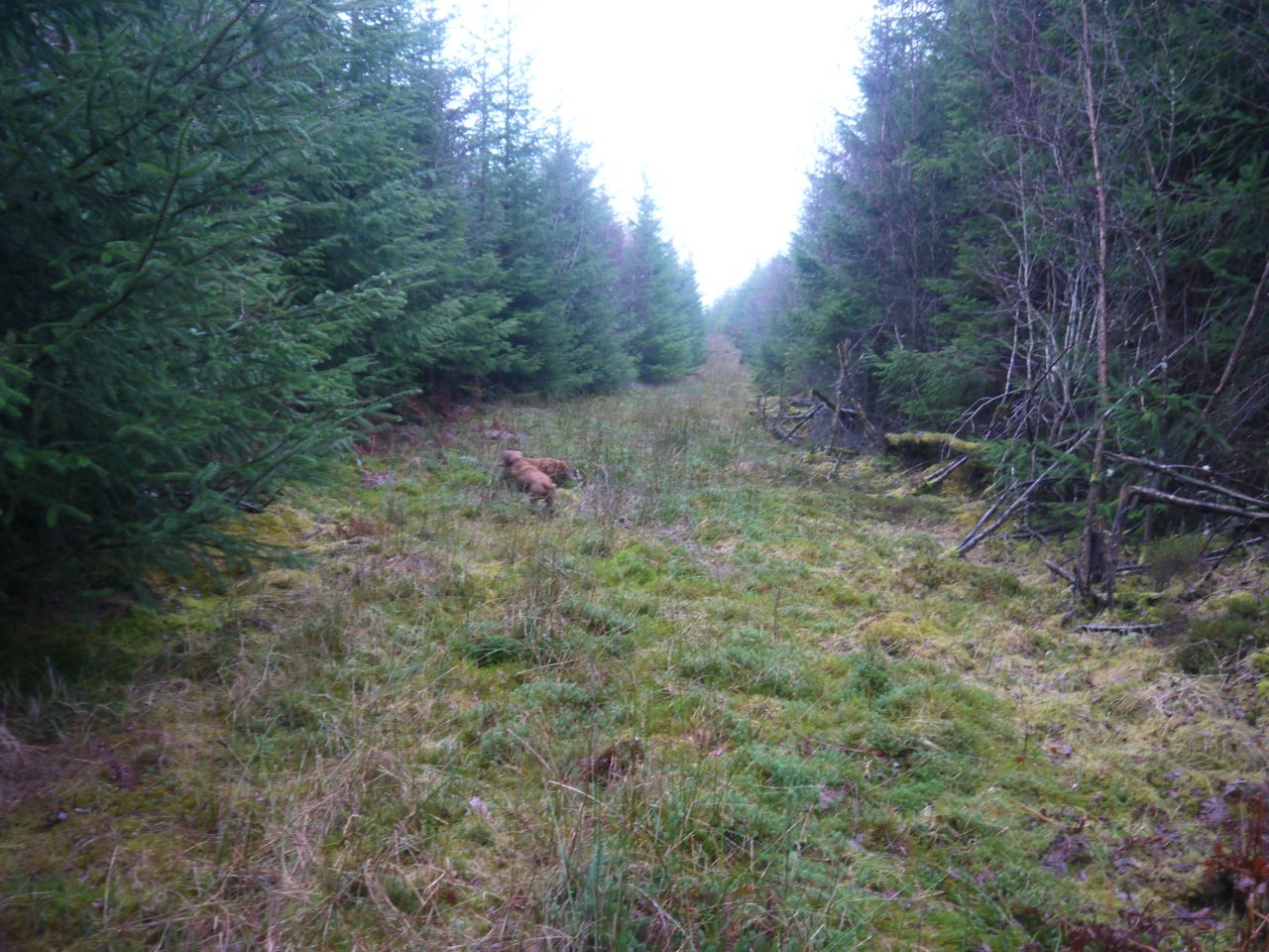 A forest break headed up from my left so we headed up along that. There wasn’t any sign that it had been used as a path but at least there weren’t that many boggy sections. Any hope that this might still be the way marked path when the forest break ended. I am sure the dogs could have made it through the woods but the branches down to knee height would have stopped me.
