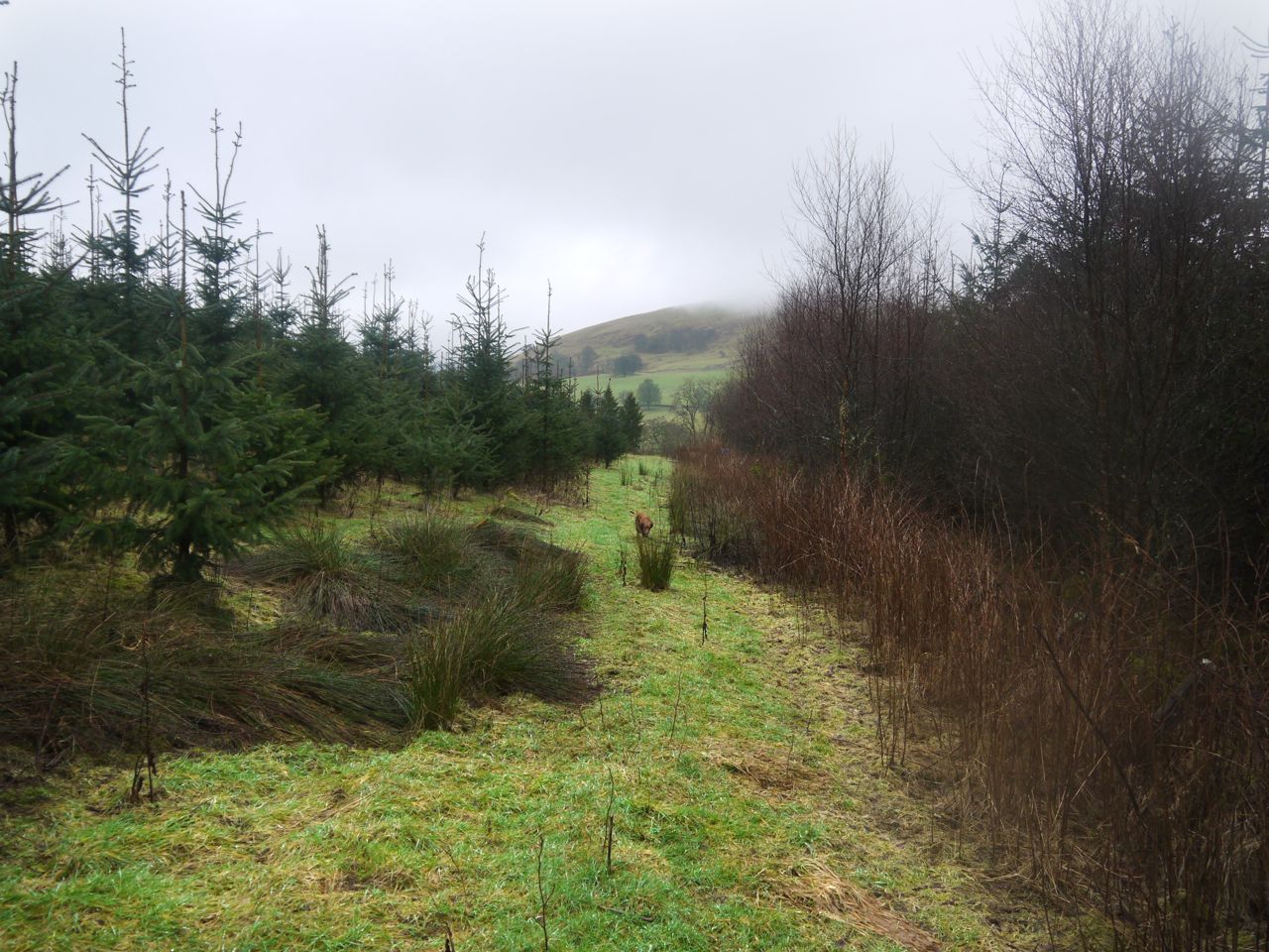 A little to the left was a plantation of young conifers (PS the laptop tried to autocorrect plantation to lactation). Between us and the lactation of conifers was a barbed wire fence, but luckily, amidst the fence posts at the fence corner, was a space large enough to get the dogs through. There was a 5m margin around the new trees, which was mostly grass, and not boggy, so we followed that which led us back to the minor road near Morton Mains.