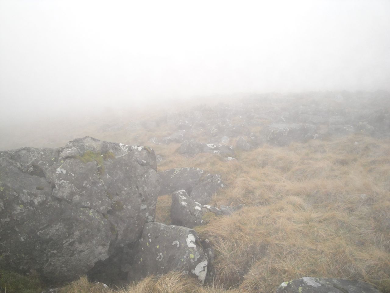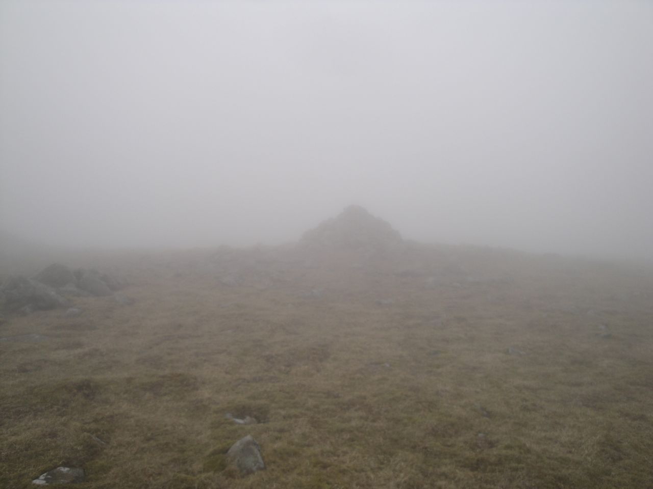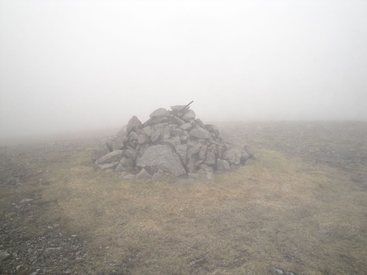 The cairn atop Beninner eventually came into view when I was almost upon it. Once there I looked beyond it and saw another large cairn in the distance that looked possibly higher, so I set out to investigate it. But I was fooled by the mist, it was a small rock much closer than I had imagined. I then turned back to see if it was higher only to find that I couldn’t see the original cairn anymore.