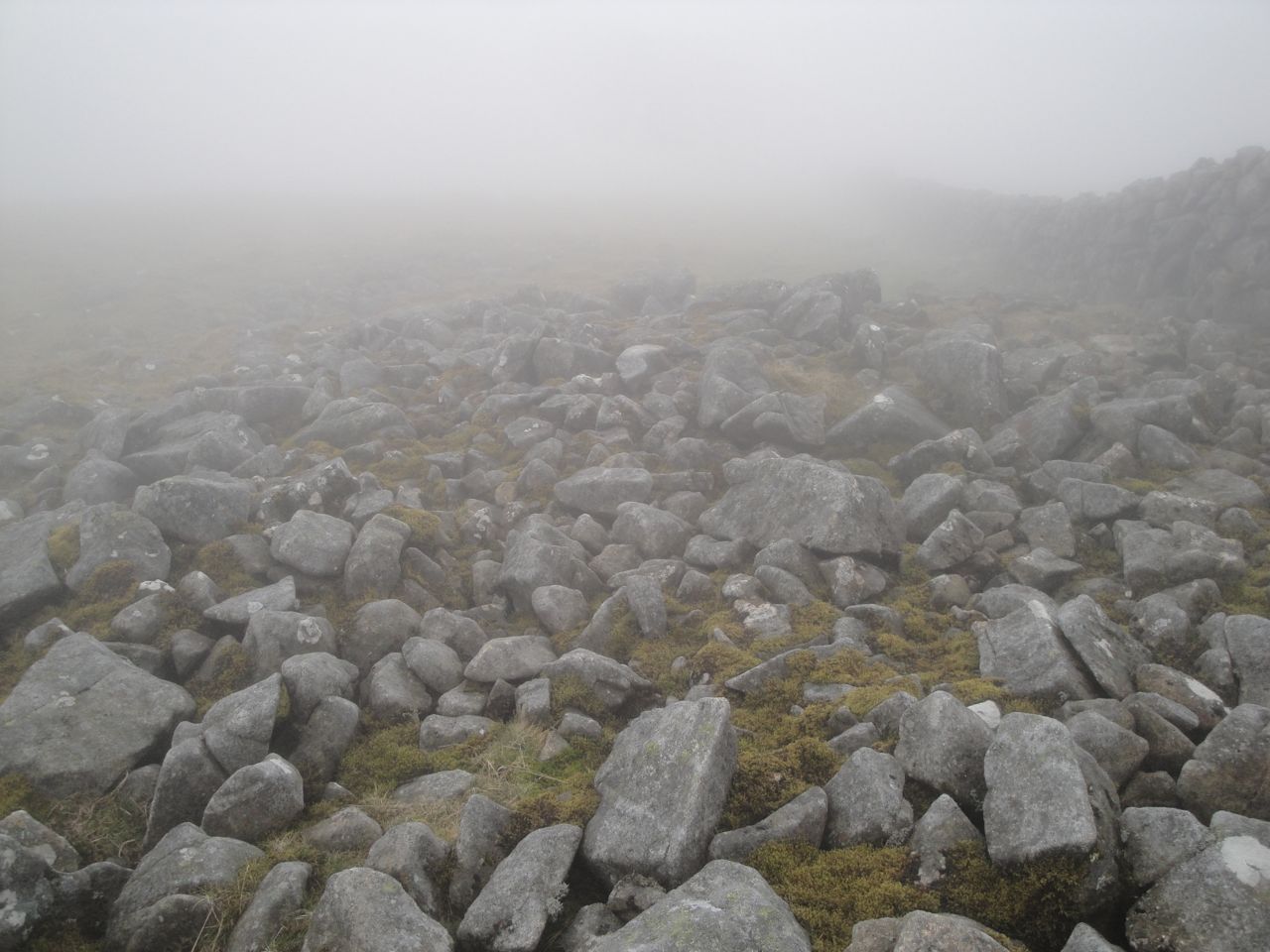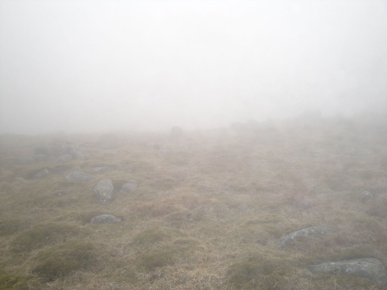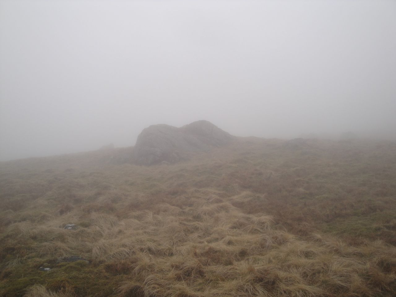 The cairn atop Beninner eventually came into view when I was almost upon it. Once there I looked beyond it and saw another large cairn in the distance that looked possibly higher, so I set out to investigate it. But I was fooled by the mist, it was a small rock much closer than I had imagined. I then turned back to see if it was higher only to find that I couldn’t see the original cairn anymore.