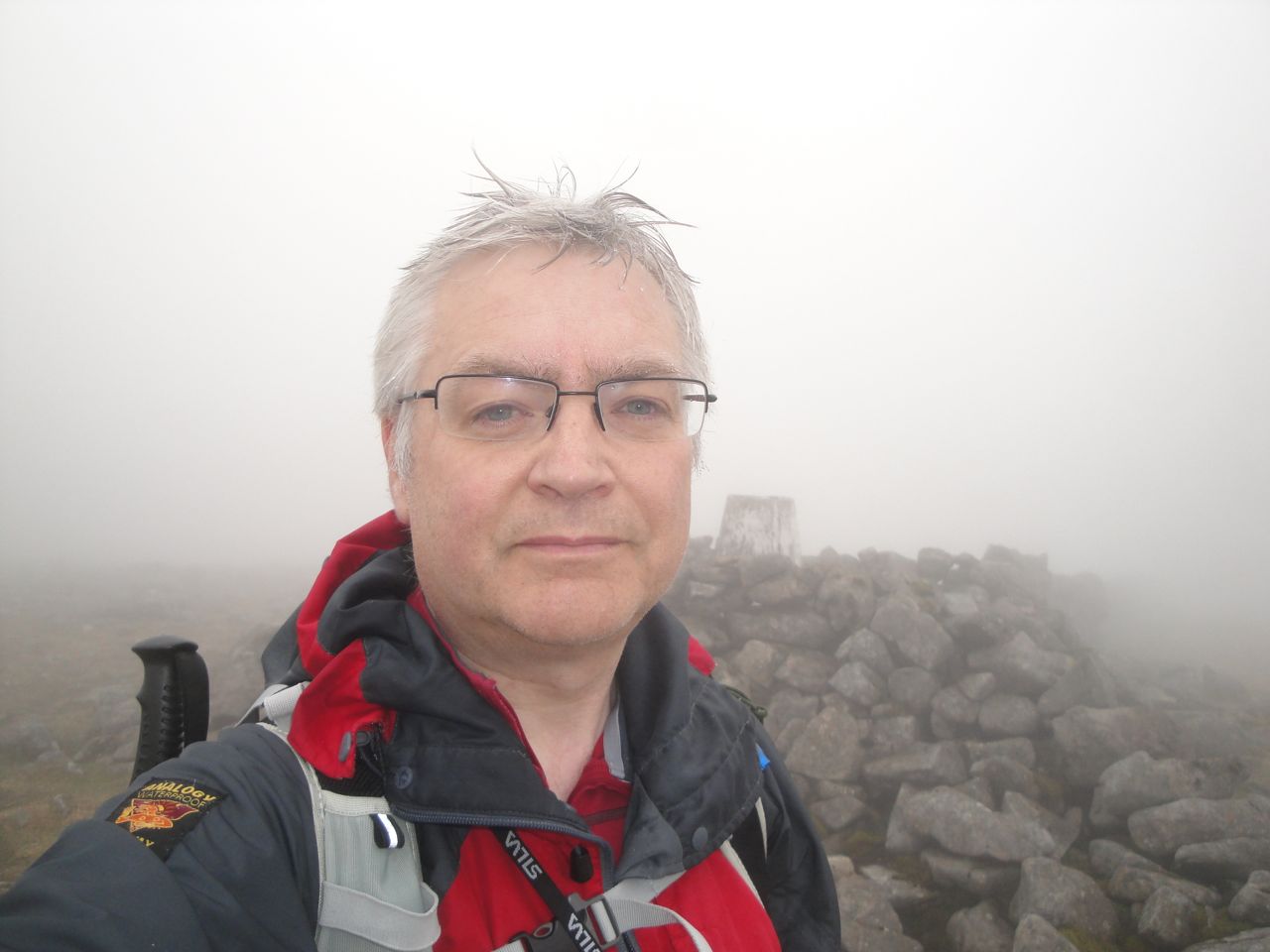 The summit has a large cairn and a larger stone shelter around the trig pillar. The last time I was up here the visibility was much the same but it was snowing and windy. This time least the air was still and warm, if a little damp.