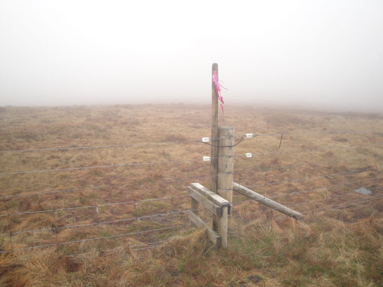 More walking through clouds had me down to the col below Beninner. An electric fence crossed the col but there was a stile with the remains of some pink balloons pinned to it. The col was boggy with several pools of water to avoid but once off the col itself the ground firmed up.