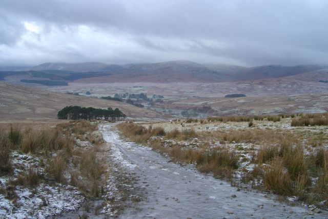 There is another dyke to guide the descent. The photo above is the view as I came out of the cloud; Dunool is on the left. There is a small burn to cross at the bottom then it’s only a few metres to the path. Unfortunately the path was very icy and there were three areas where it had flooded then frozen, but with thin ice overlying the icy water. I had to climb around these.