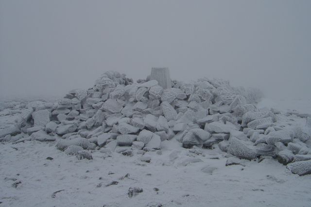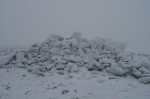 The ridge across to Cairnsmore was covered in light snow and visibility slightly poor but not dangerously so. The drystone dyke ends at Black Shoulder and compass was required to find the right direction. There were some footprints in the snow, but heading in the opposite direction. Eventually the large cairn at the summit of Cairnsmore of Carsphairn loomed out of the mist.
