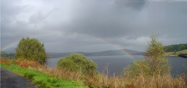 A walk around the Clatteringshaws cycle path. It was sunny most of the way round but clouded over and started to rain when we stopped for lunch. At least we were treated to some rainbows.