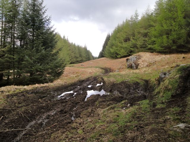 This ground needed crampons. Soon though I emerged from the forest and began the climb up Coran of Portmark. The bikes had been here too but the ground was better drained and only a few sections had been churned to mud. The going underfoot was much easier but the gradient worked me into sweat.