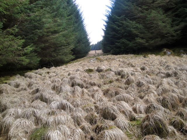This was the usual tussocks, but interspersed with tussock free zones made of deceptively slippy moss covered slick. One section of Dougals had small bushes of bracken that appeared dead, perhaps due to the bogginess, but could have still been in winter mode since the light here was markedly limited by the trees. I remember thinking how unpleasant this would be to walk through if the bracken grew larger. In retrospect, this was a little like one of those horror films where whatever you think about (your worst nightmare) is spun into reality by an evil being.