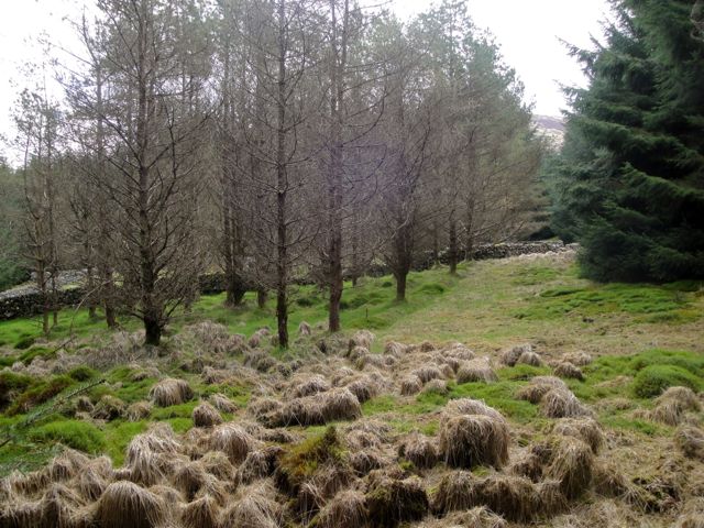 The path, if you can call it that, eventually passed a long lost sheiling which now encircles mature trees rather than livestock. My photo of this looks as though the Dougals are rushing out ahead of me. I wonder if they do that, run about until I come by and then freeze in place? Perhaps the forest sprites were driving me crazy.