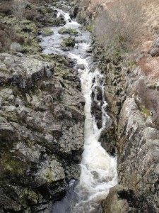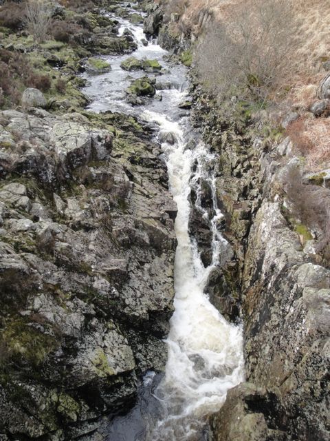 I headed off Black Craig towards the forest break I had emerged from earlier but the going was difficult. Not especially so but I decided to make it easier for myself by heading for the path up Coran which would involve less wild walking. This would require care in poor visibility as I found myself looking over a steep gap in which the Polmeadow burn runs. I had to follow this down a way to below the waterfall to cross the burn. Then I was back on the track about 250m from the tree line. From Black Craig I could see the forest break I wanted to take down to the shore (along the dotted line on the OS map). I’m pleased I did this since once there the break was not easy to see. It begins just about one or two trees along the path I had come along earlier but heading SW.