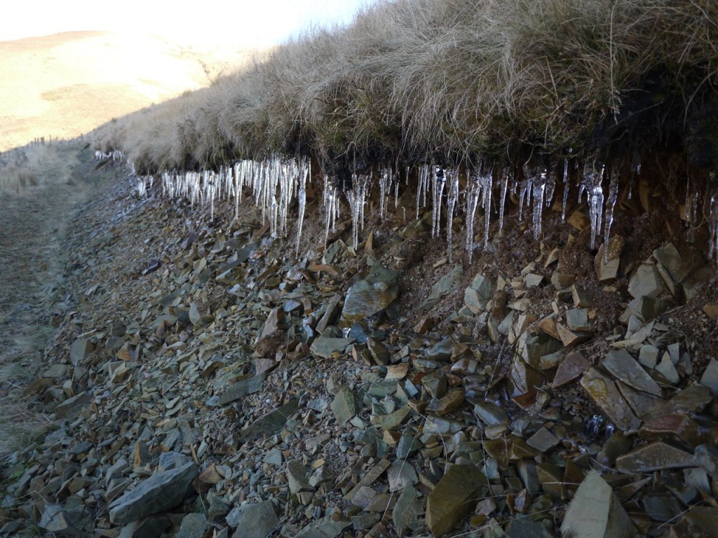 The climb up to the ridge of South Mid Hill proved interesting since it was over partially frozen moss, grass and pools of water. The sensation and sound was like walking in snow: crunching, and occasionally the more worrying crackling of frozen puddles. Once I got onto the ridge there was a faint track, which was presumably made by walkers who had not stayed on the path as far as I did.