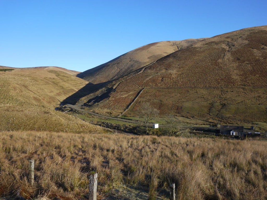 There is a plantation of larch and spruce on the road above Billhope with space to park a car or two at its gate. From there, in bright sunshine, but freezing temperatures I set off for Billhope and the bridge over Billhope Burn. Walking down the road, ruminating on how appropriate -hope (hollow) was as a name, I spotted an opportunity for a shortcut  by crossing a field directly to the bridge at NY445977, perhaps saving 400m. Entering the field proved easy since there was a gate, but exiting presented what management types call a challenge, with two barbwire topped fences in the way.