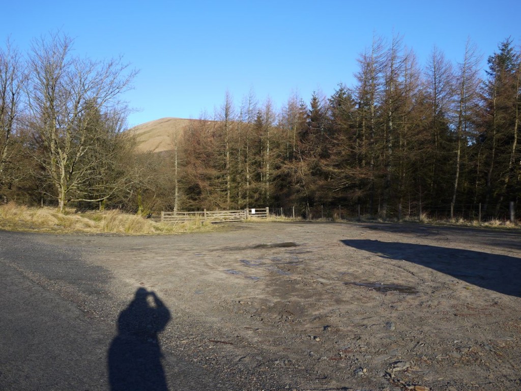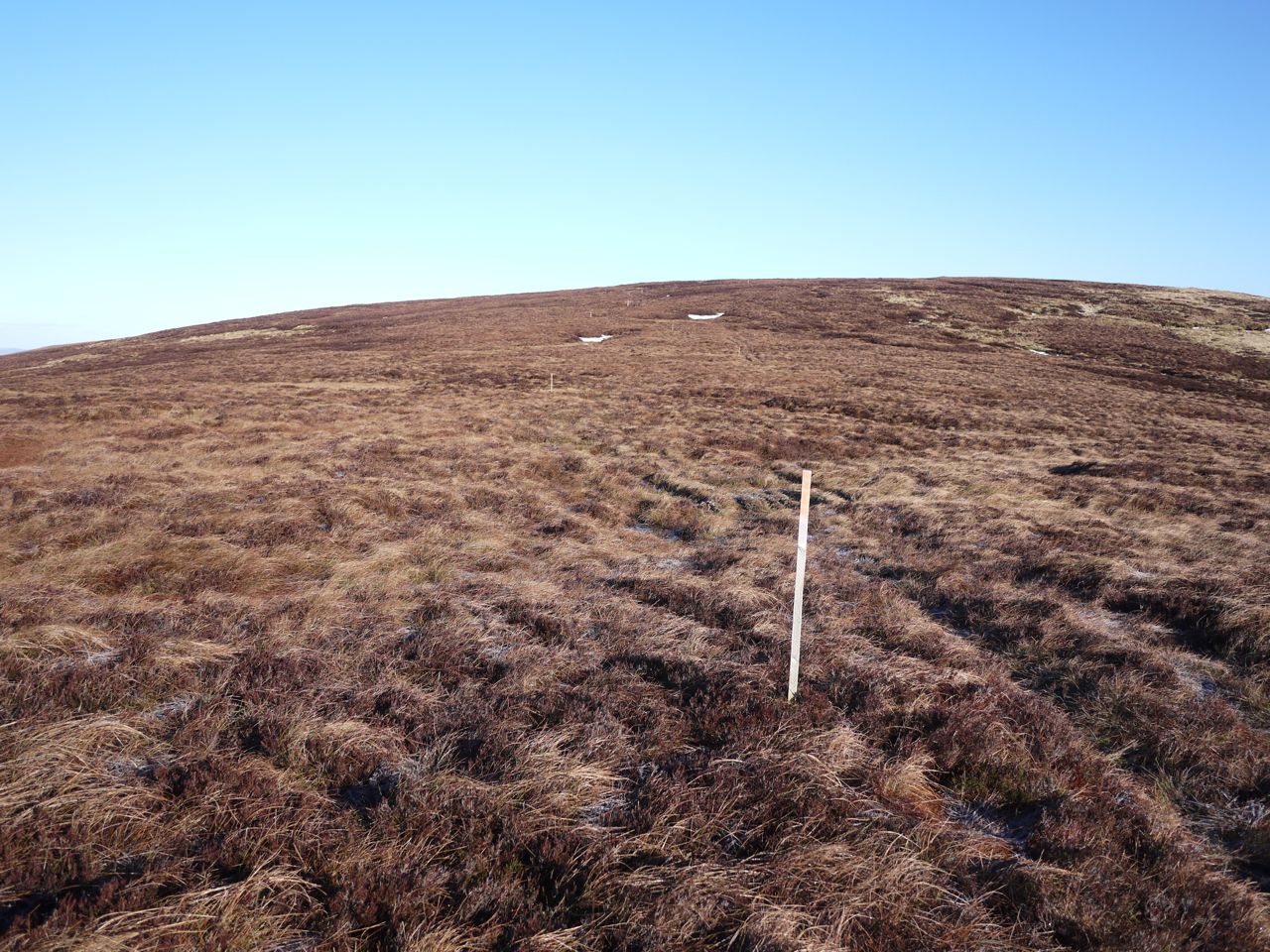 Someone had planted a number of orange topped stakes along the way which proved as good a route as any and once at Muckle Land Knowe there was a fence to follow for the rest of the walk. A my appetite grew I wondered where I might find some shelter for lunch. The hollows were filled with snow and I worried if I might be swallowed up by peaty mud beneath it. Archeologists millennia from now would find me and write papers on the meal I had eaten before being cast into the bog. “As with many of the peat bog bodies he had eaten the ritual meal of bread, ham, cheese and pickle”.