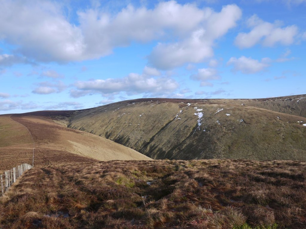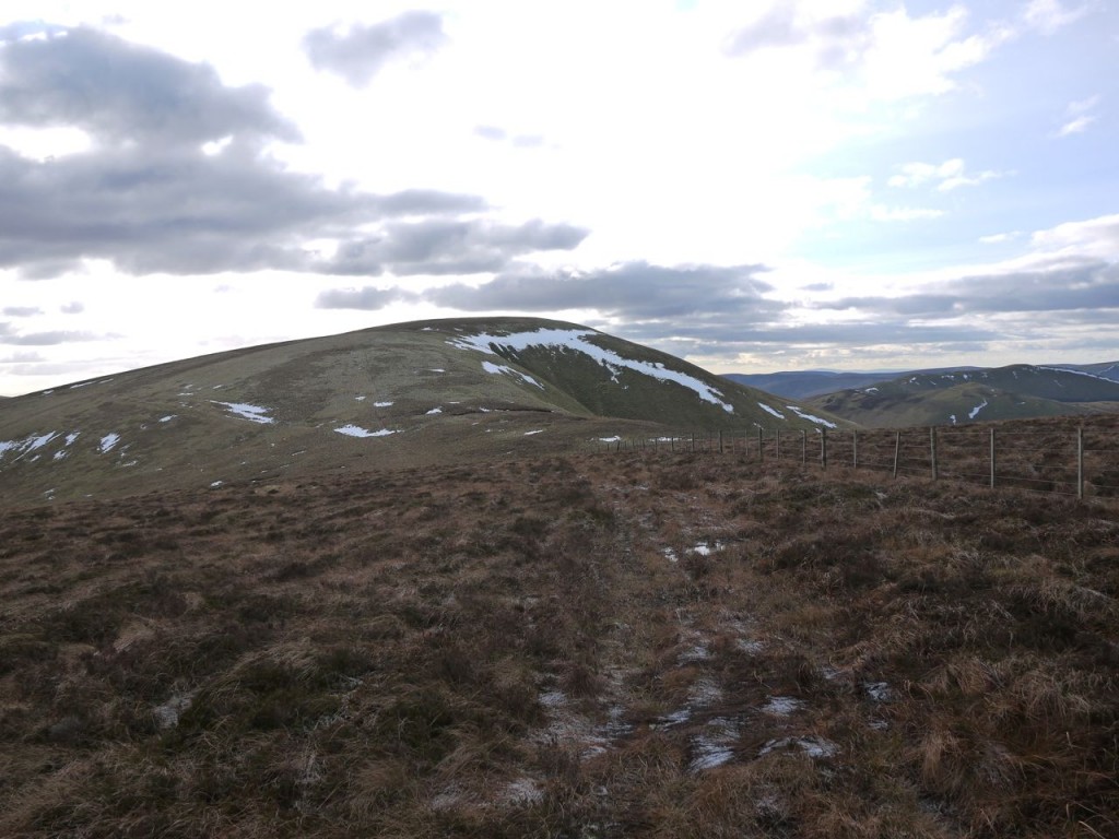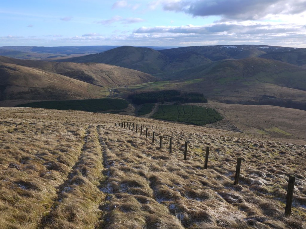 Cauldcleuch Head, the main aim of this Donald-bagging walk, proved quite underwhelming of itself. Nothing other than a trivium of fences marked its summit but being the highest point thereabouts it had extensive views: Skelfhill Pen and the Eildons to the north, and the snow covered hills of Moffat and the Cheviots to west and east.