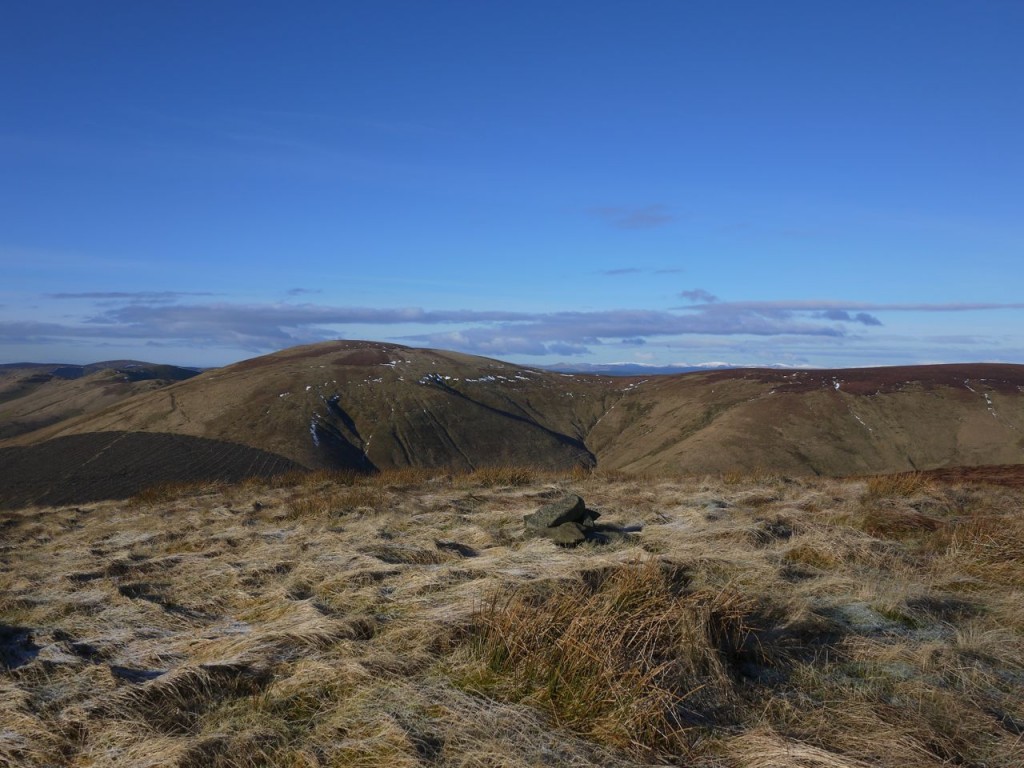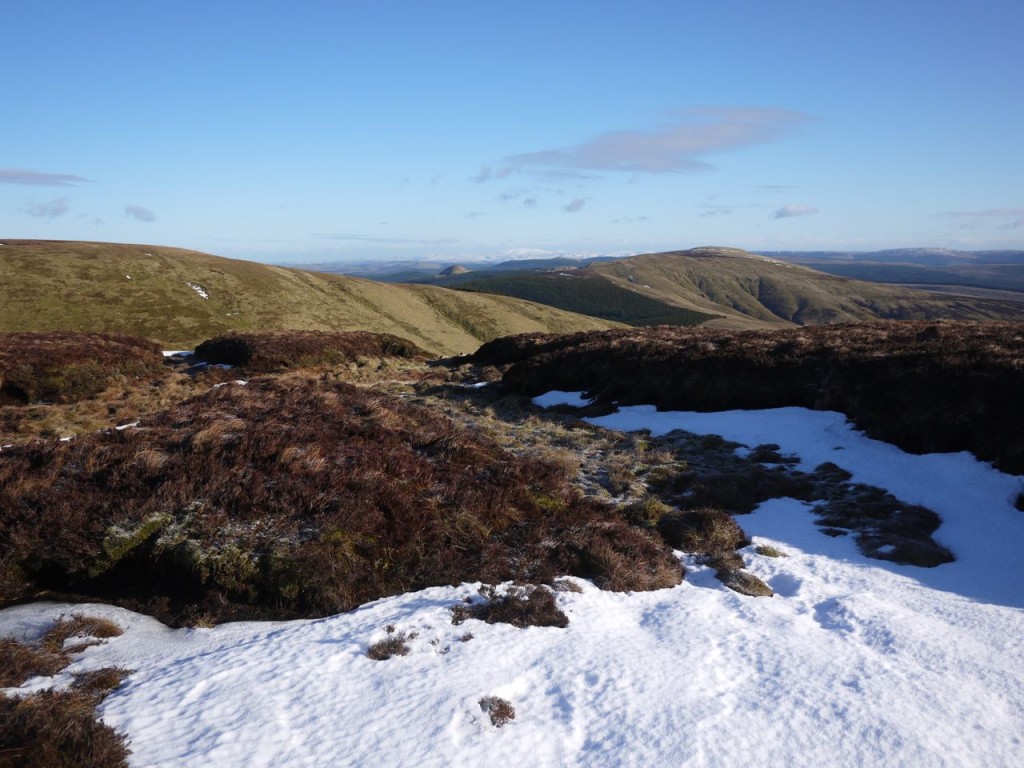 I walked through the semi-frozen bogginess of South Mid Hill, the sun glinting on pools of water, and found that the ground firmed up once I reached the higher ground of Stob Fell. There were small areas of snow in hollows but the distant Cheviot and Moffat Hills were completely white.